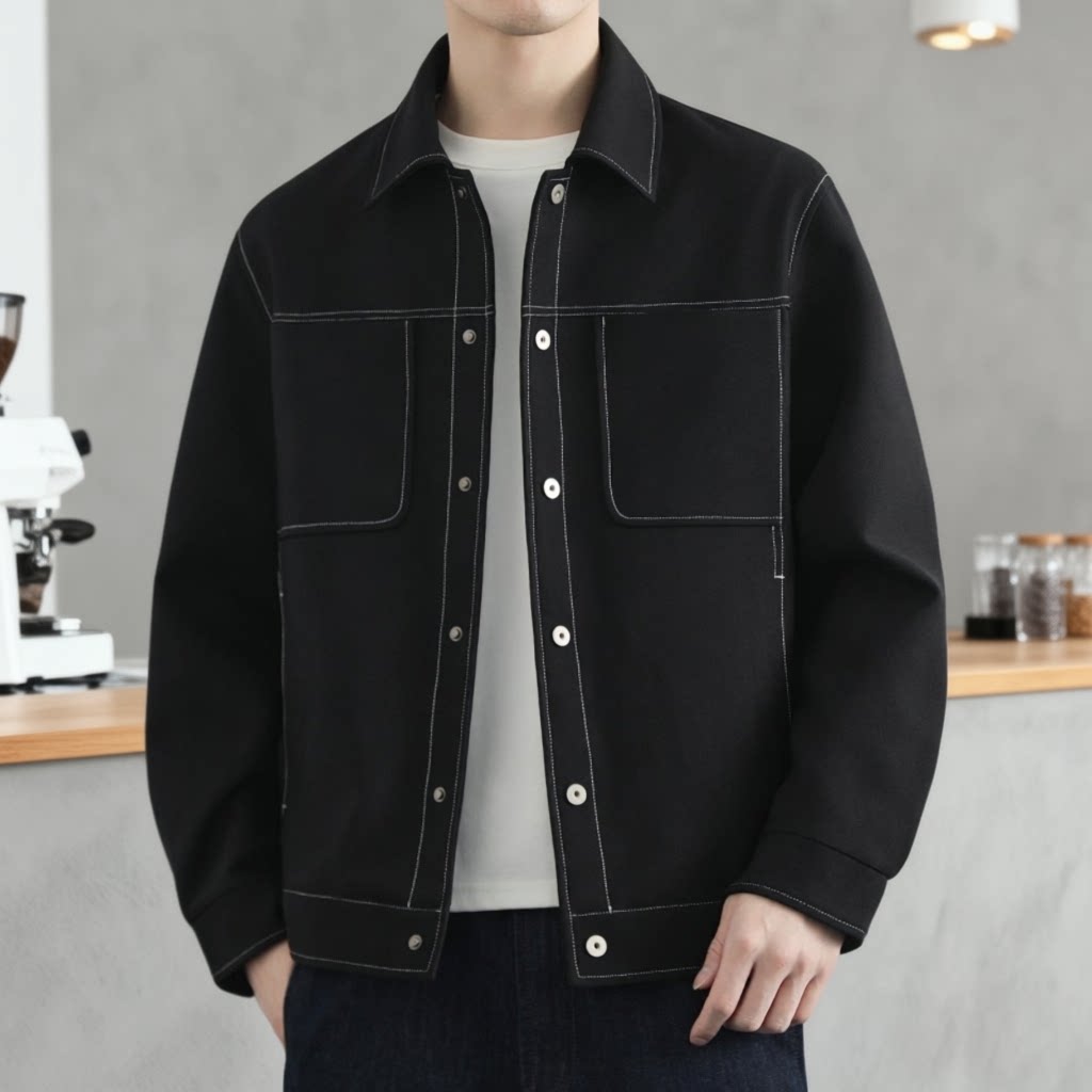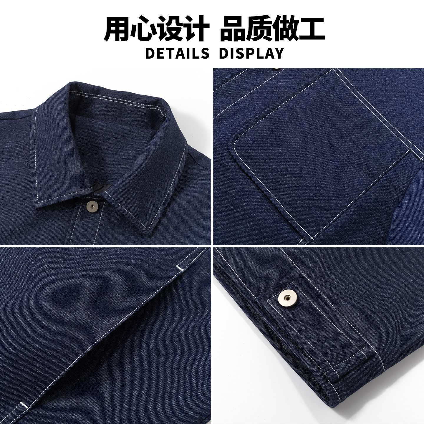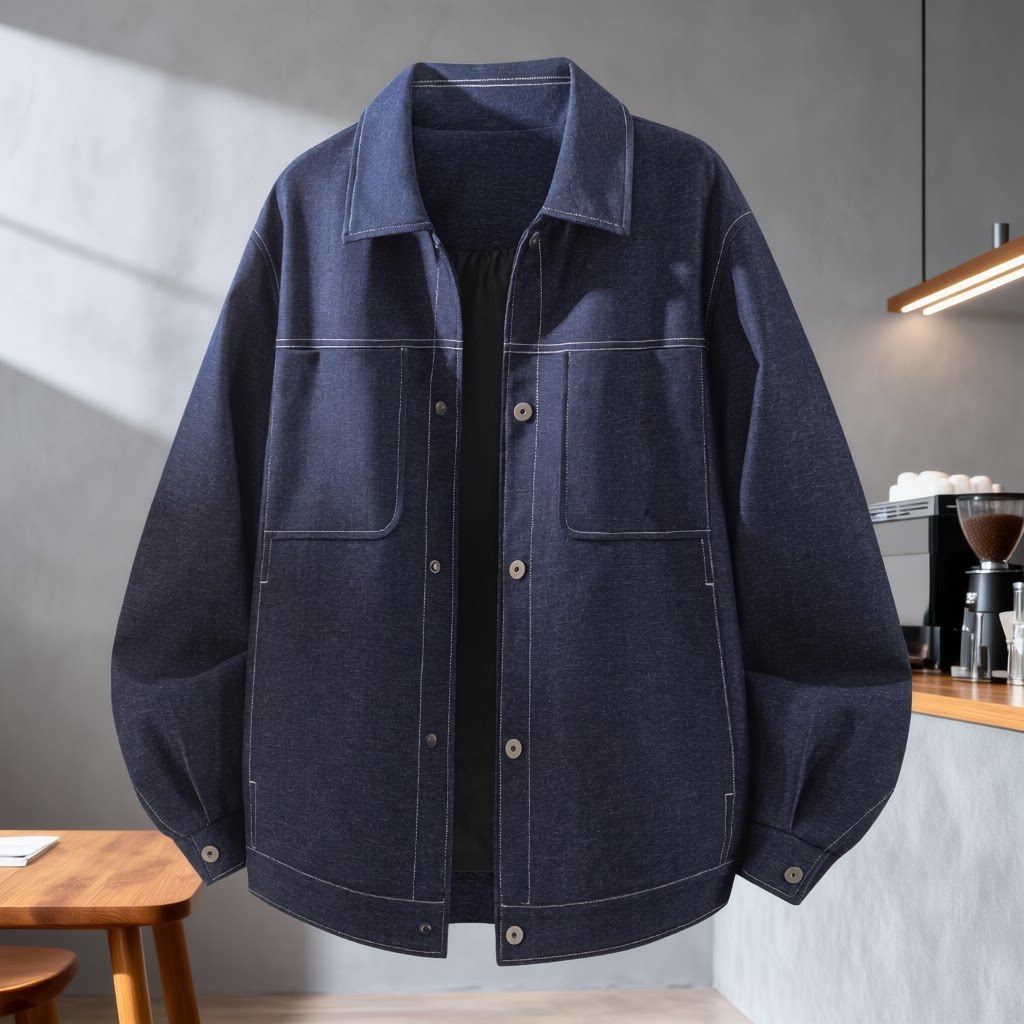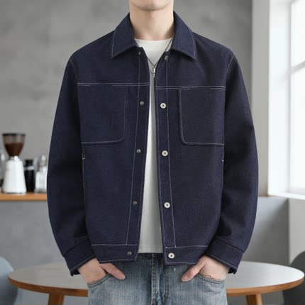 男士翻领牛仔外套男宽松型休闲潮流短款按扣夹克深蓝色长袖夹克衫
