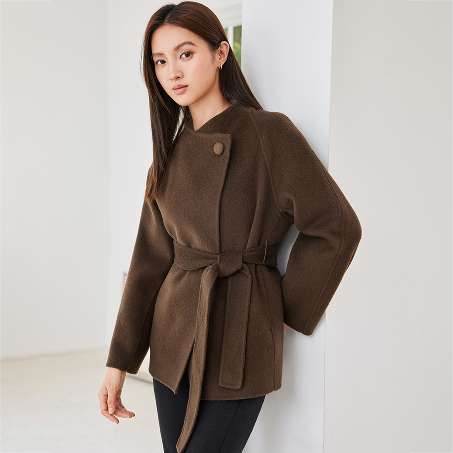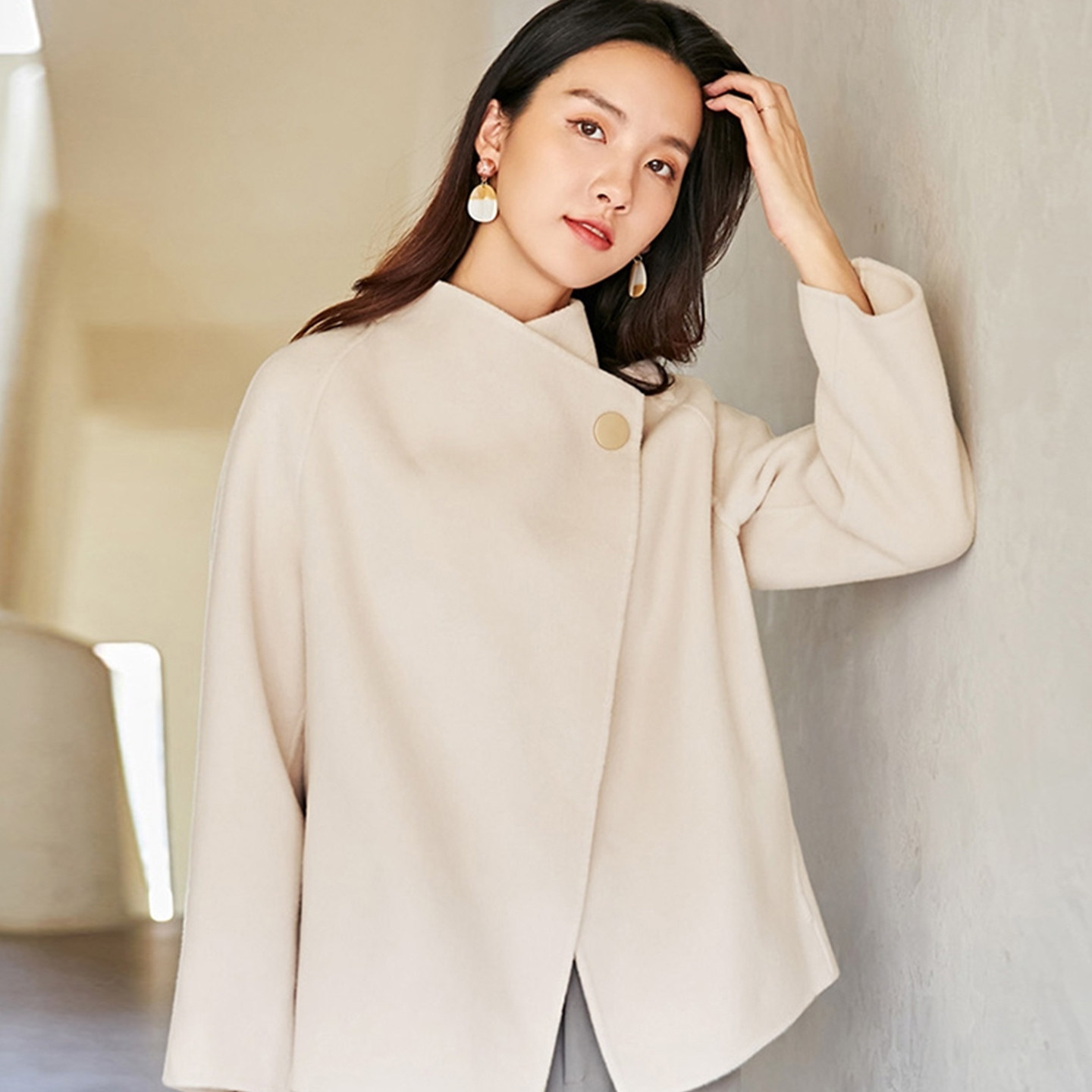 气质休闲宽松斗篷秋冬纯羊毛大衣女一粒扣立领短款毛呢外套女