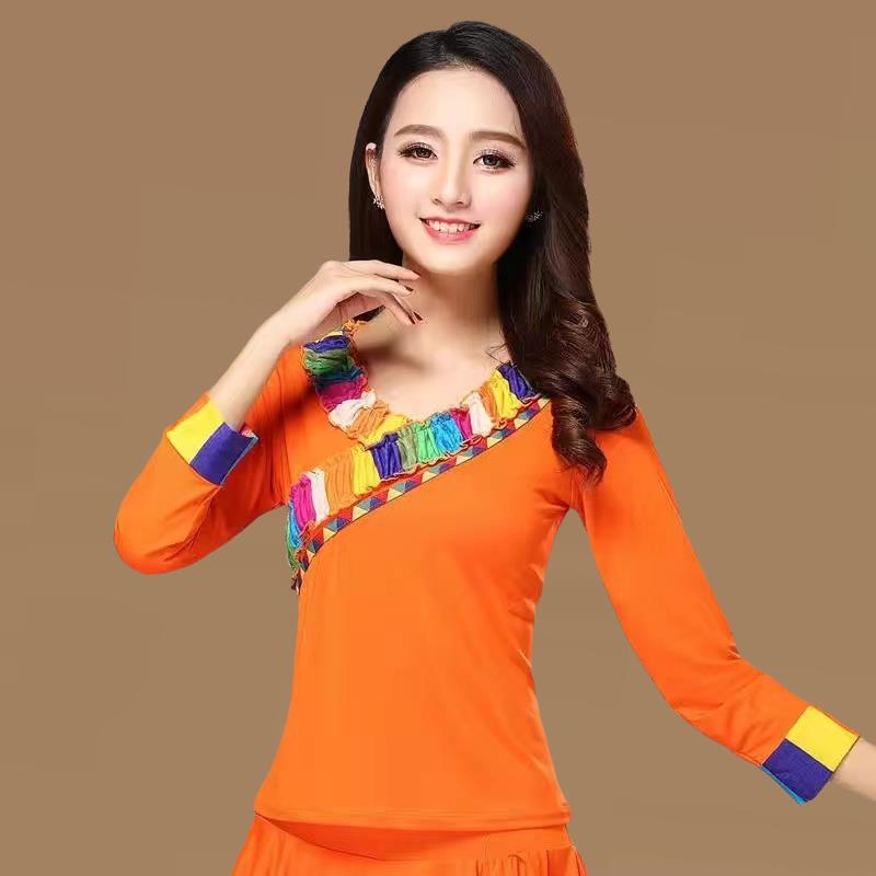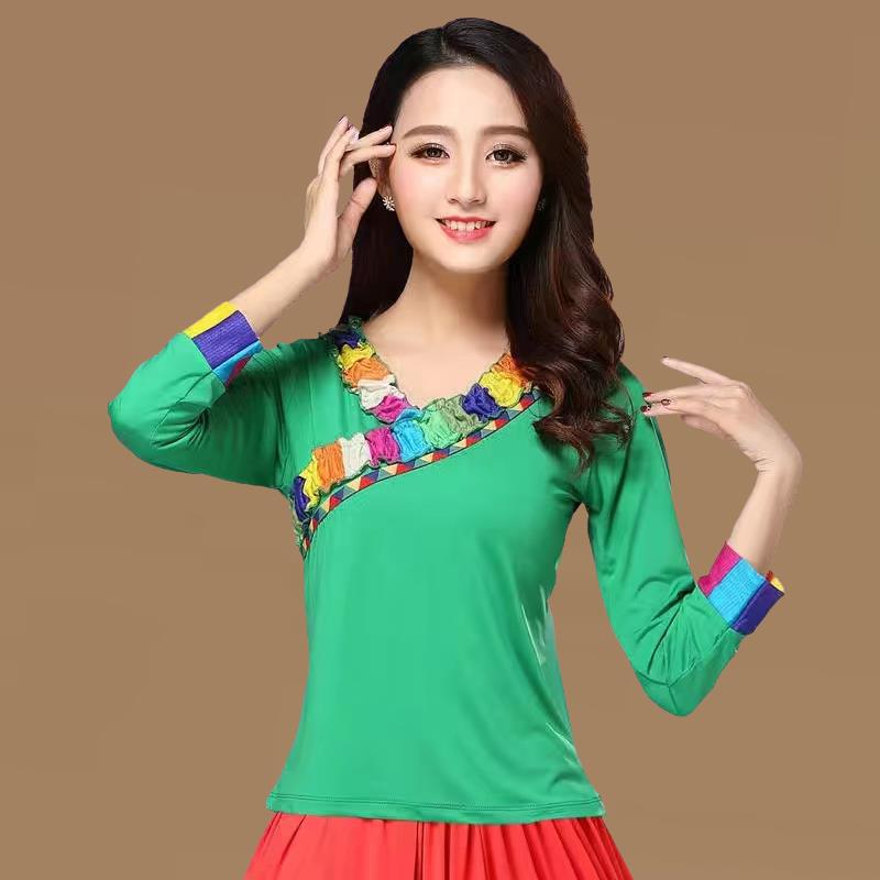 新款藏族演出民族风牛奶丝V领中袖上衣 广场舞服装新款长袖中老年