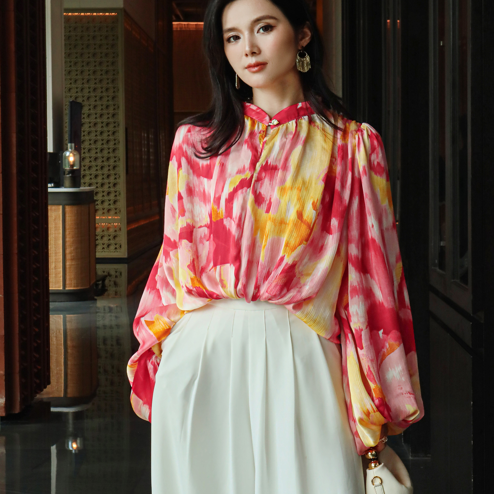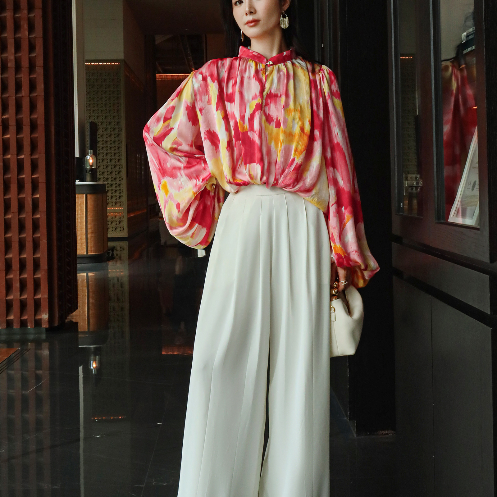 法式度假风新款时尚气质优雅减龄灯笼袖雪纺缎印花宽松立领衬衫女