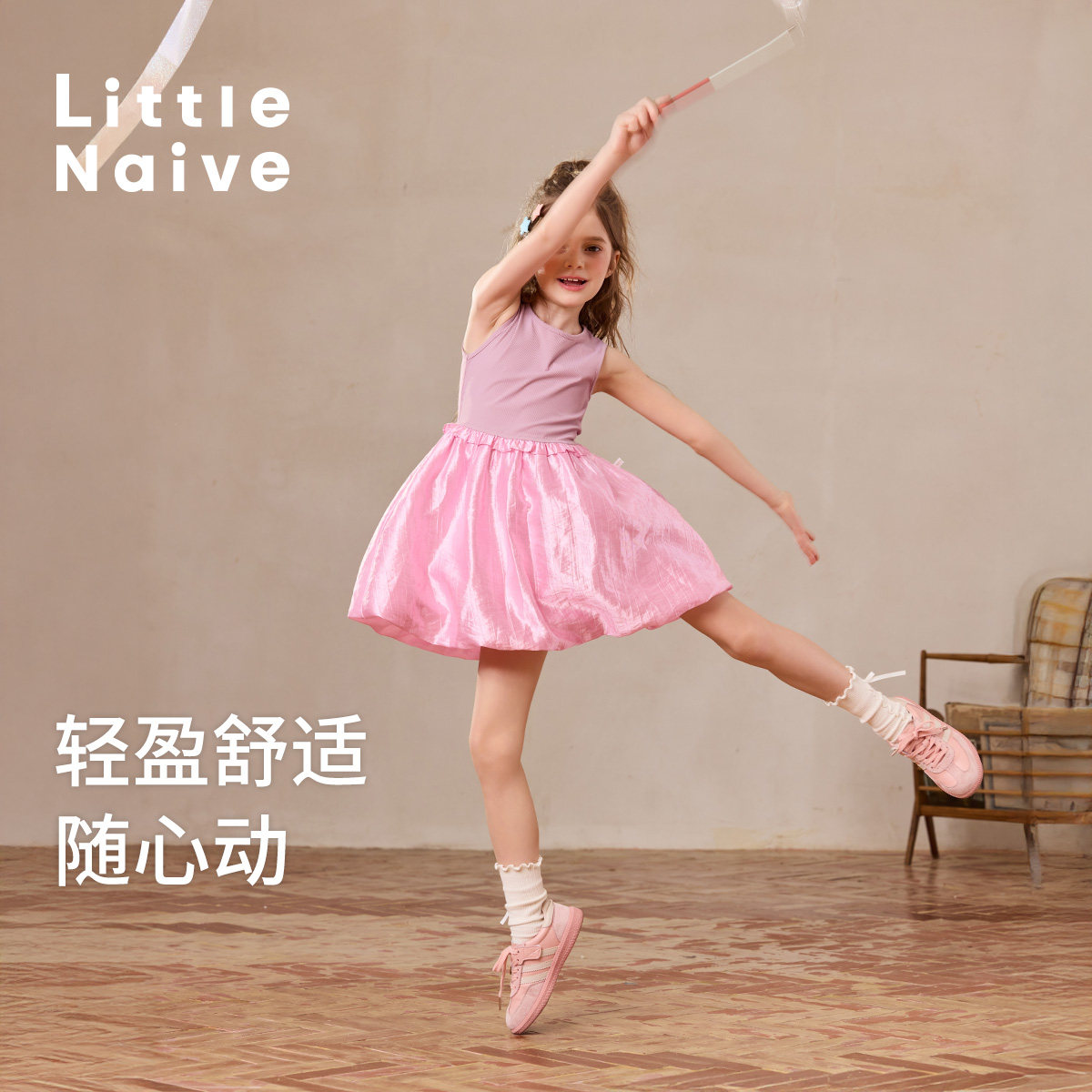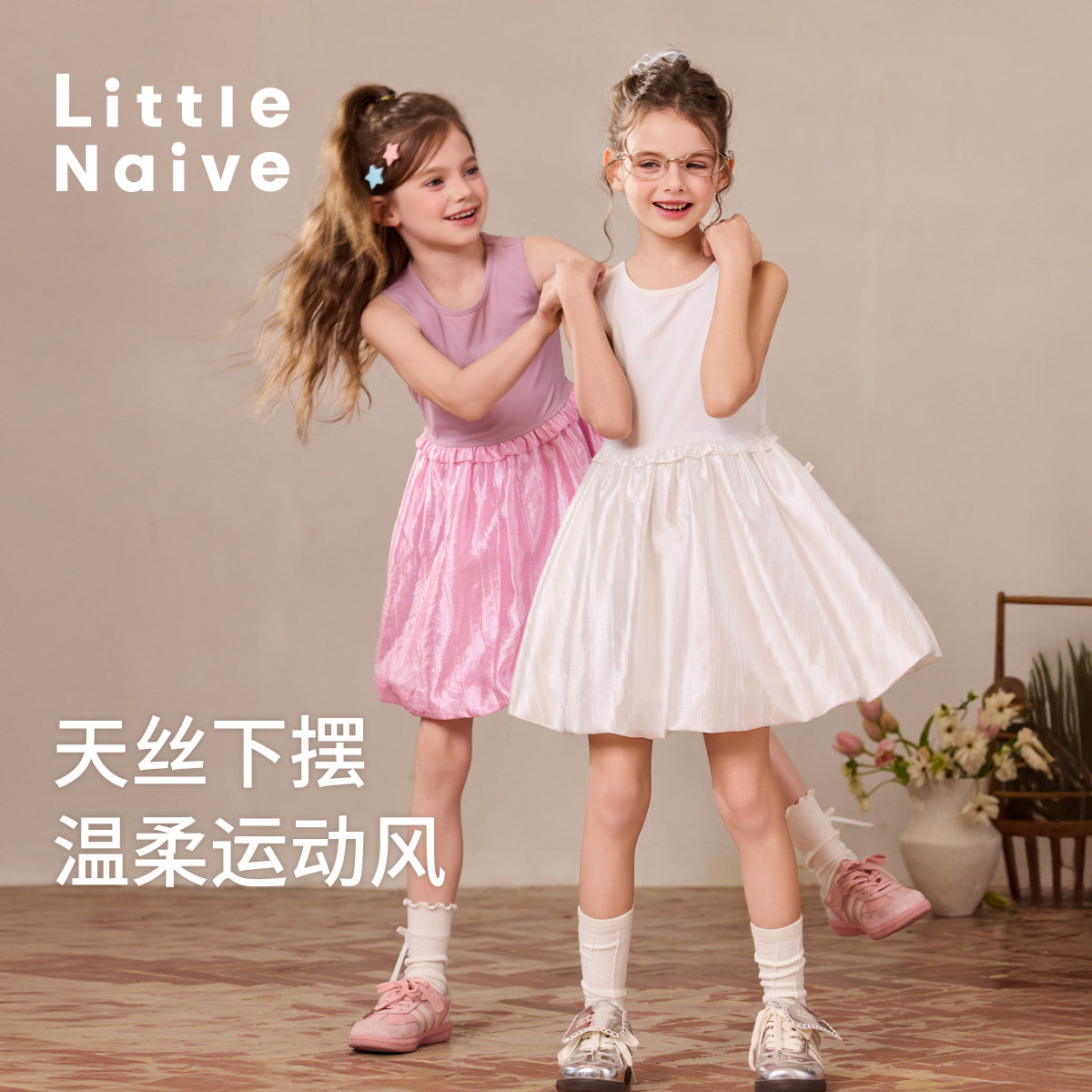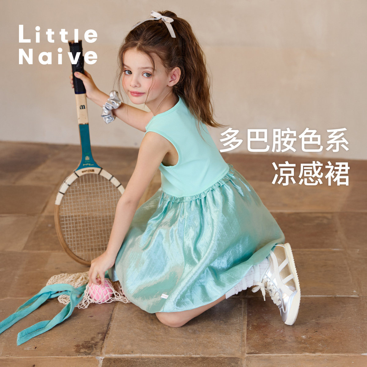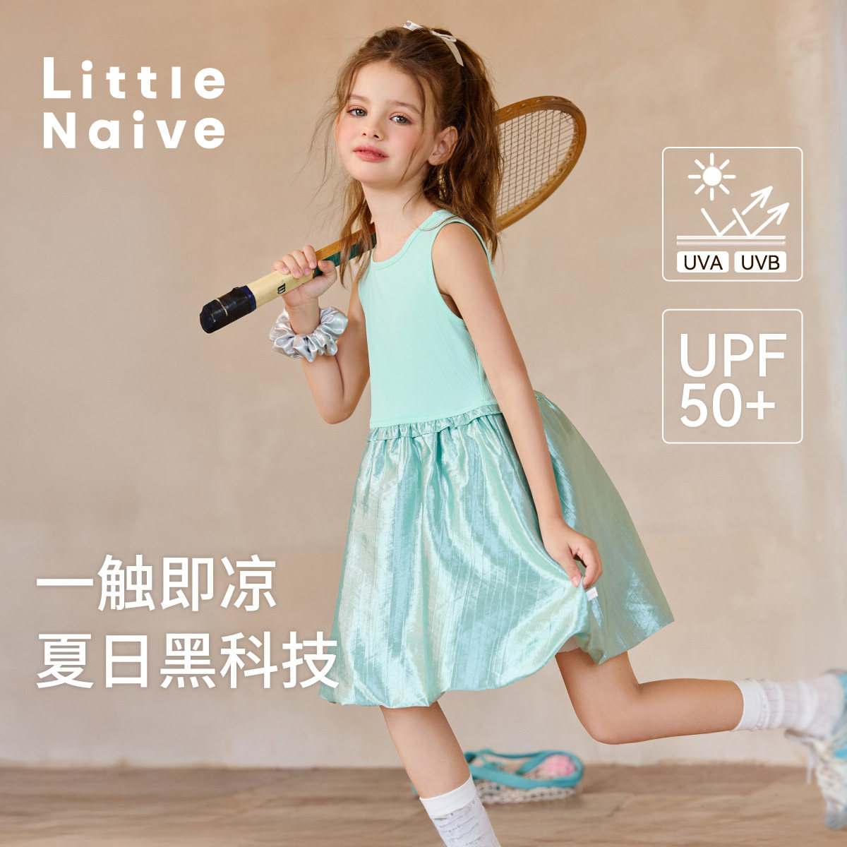 Little Naive女童连衣裙夏季新款光泽花苞裙儿童凉感防晒背心裙