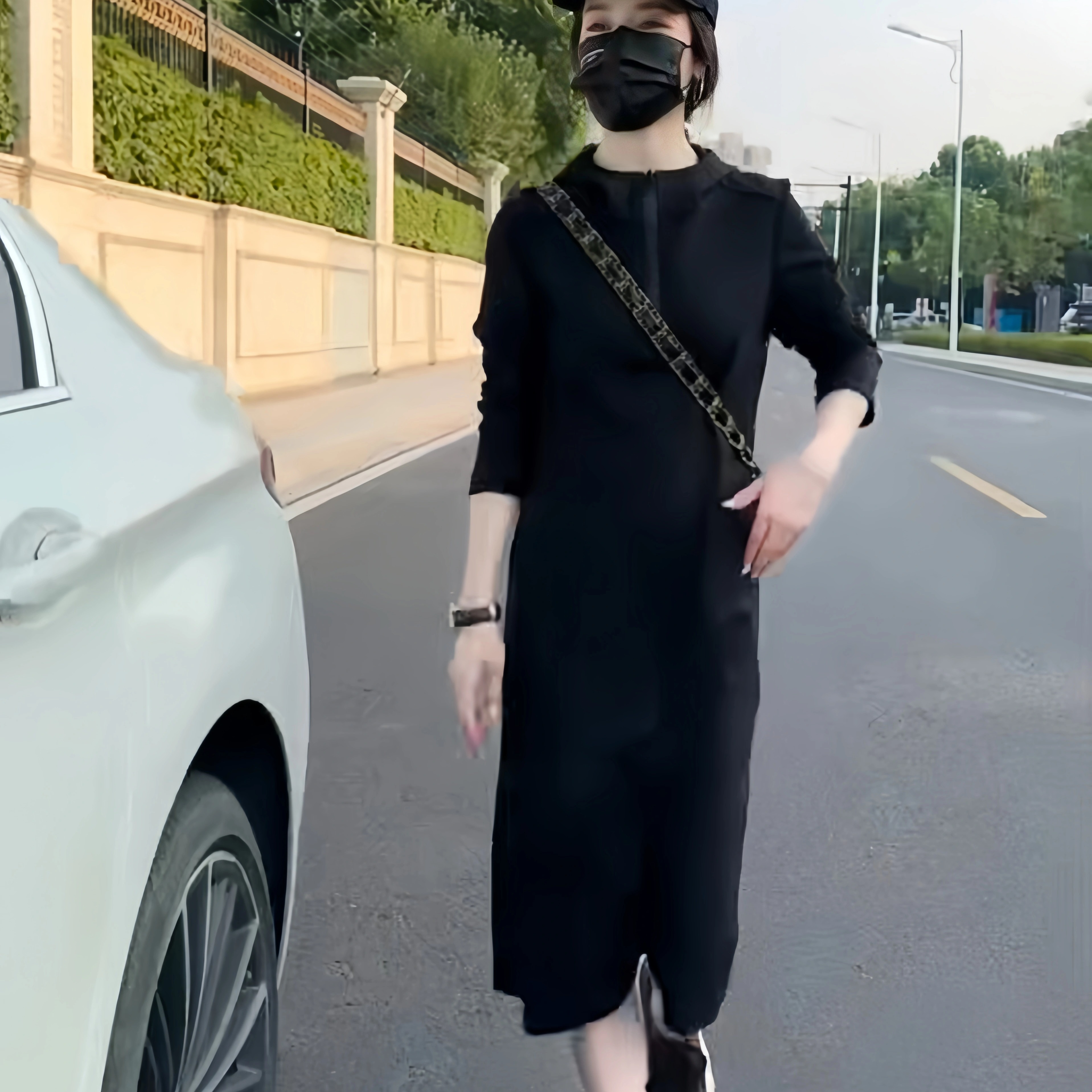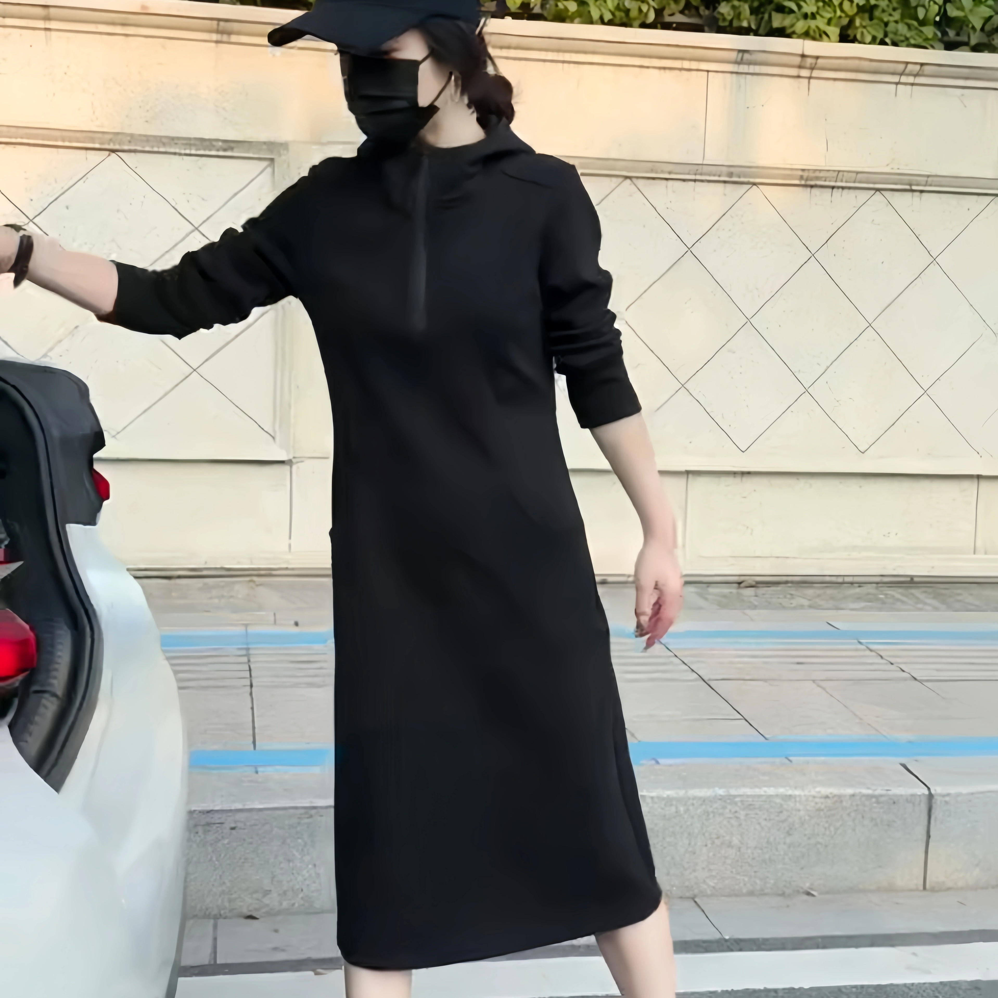 气质连帽半拉链连衣裙女2025秋季新款中长款洋气休闲韩版显瘦长裙