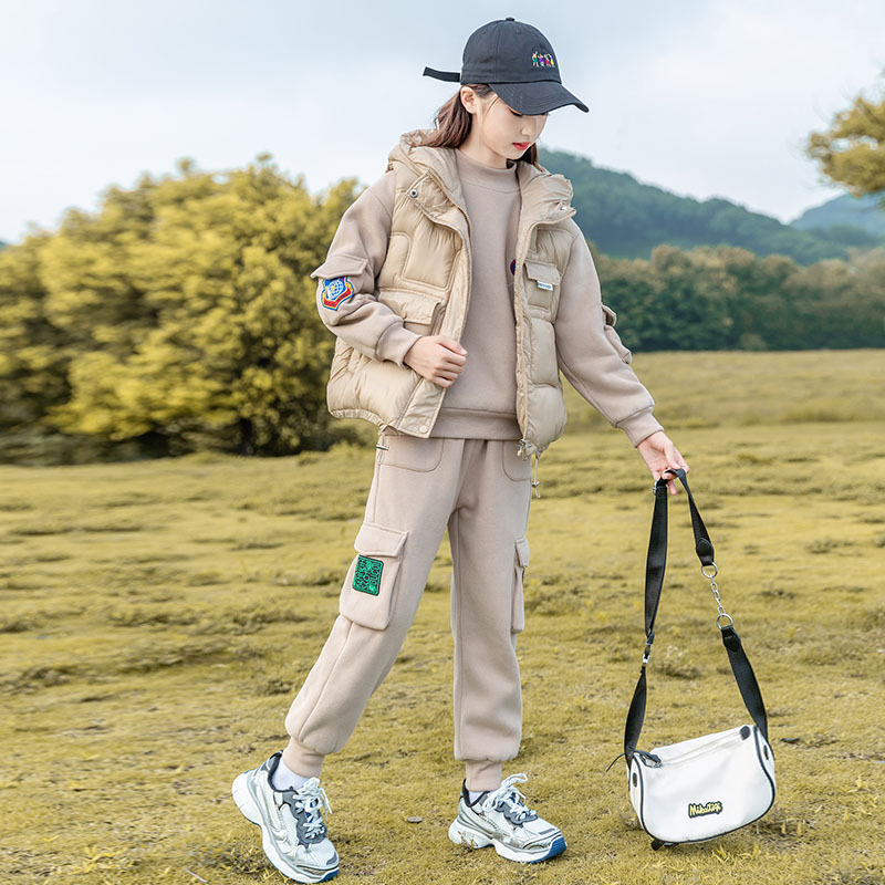 NK品牌联名女童运动套装2024秋冬儿童装加厚加绒卫衣马甲三件套