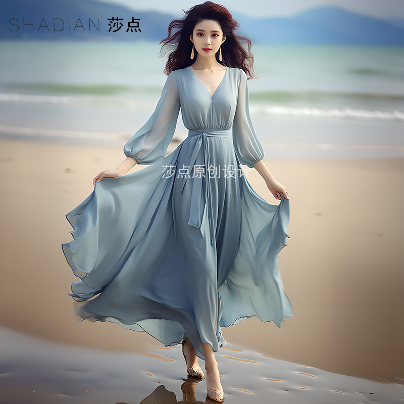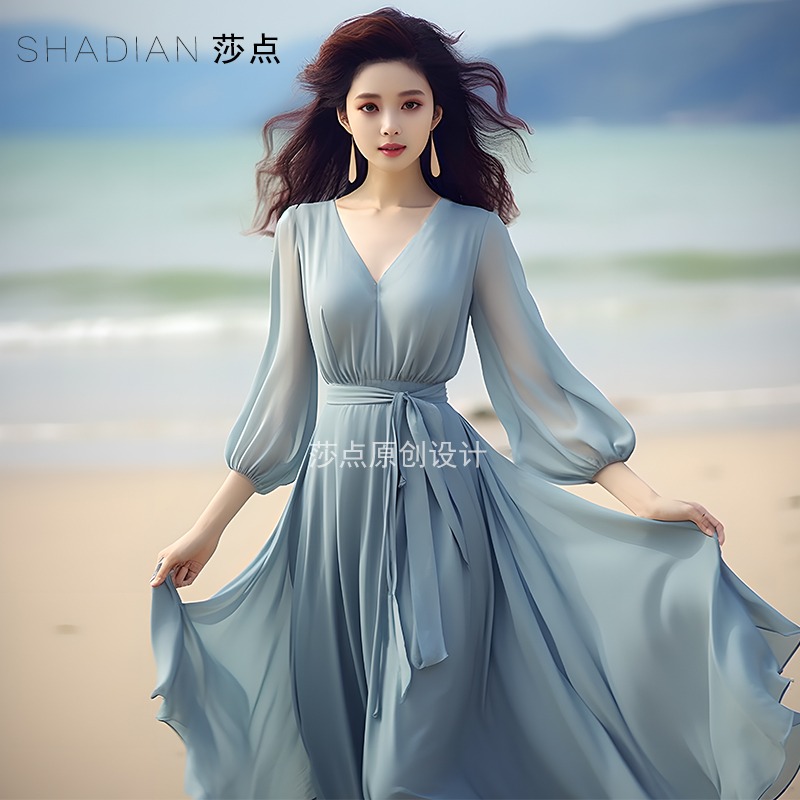 今年流行蓝色连衣裙海边度假长款裙子收腰显瘦大摆裙高级感沙滩裙