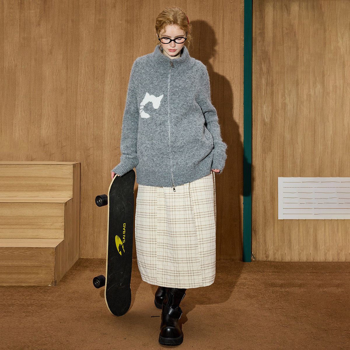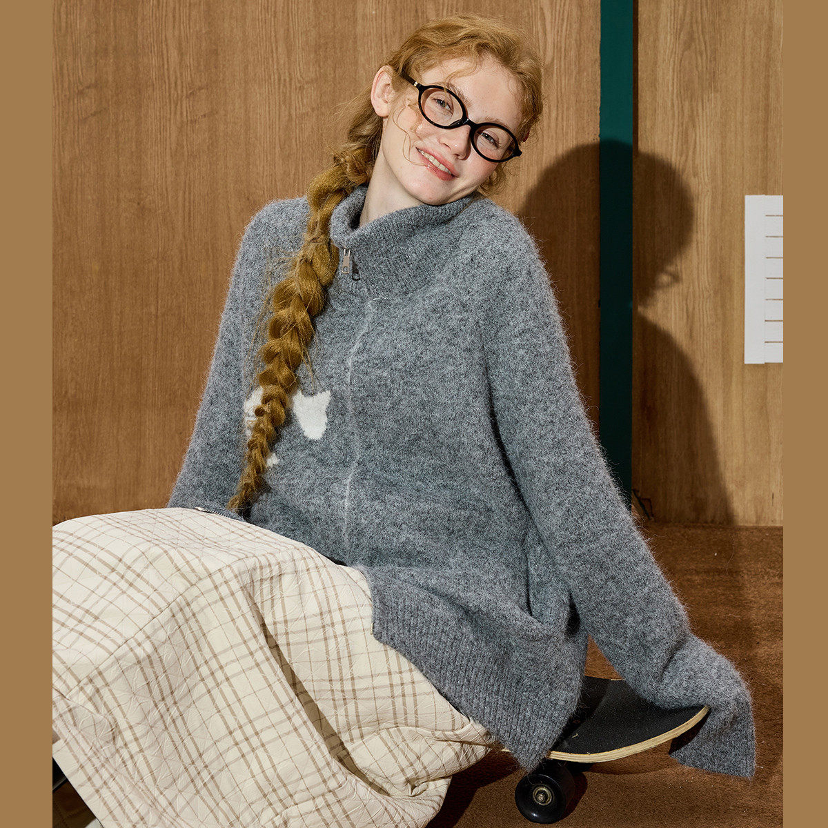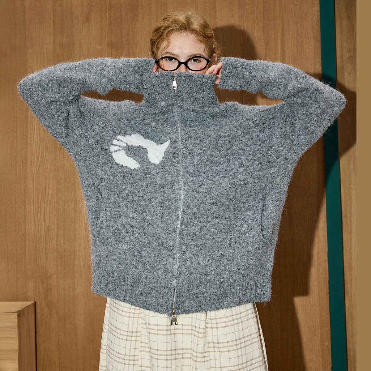 coolhut半高领灰色宽松拉链设计感猫咪图案拉链针织开衫女毛衣