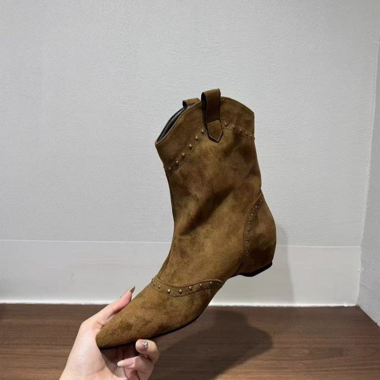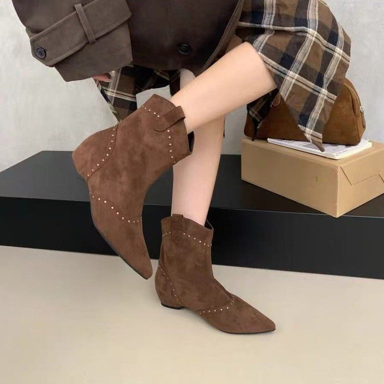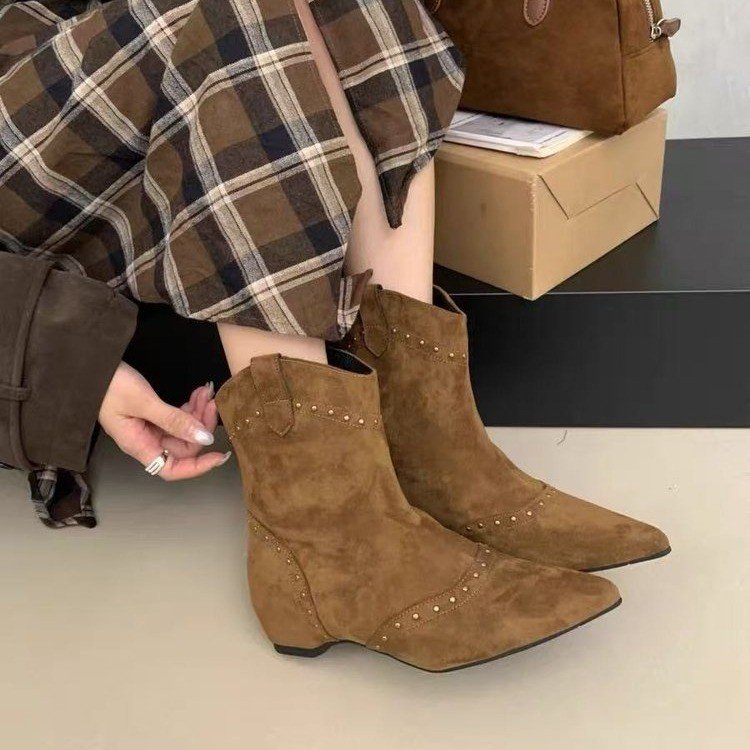 品牌内增高4厘米短靴女2025秋冬季复古绒面尖头瘦瘦中筒时装靴