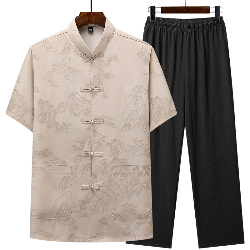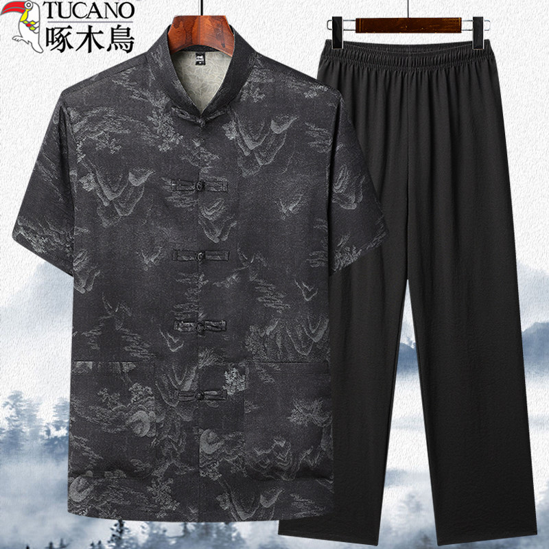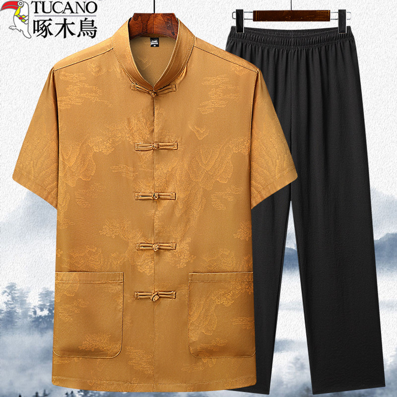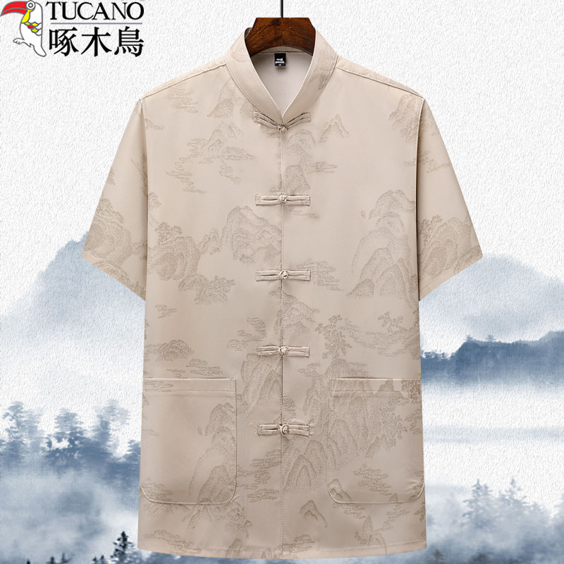 啄木鸟唐装高端男士短袖中老年人夏季爸爸套装衬衫爷爷衬衣桑蚕丝