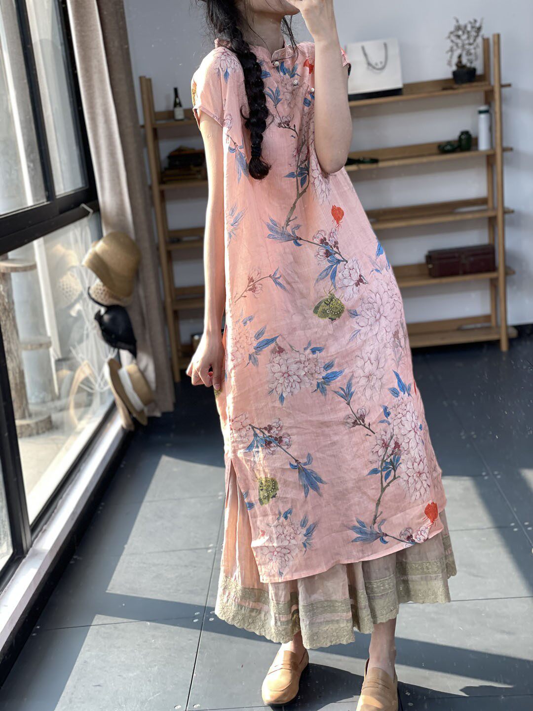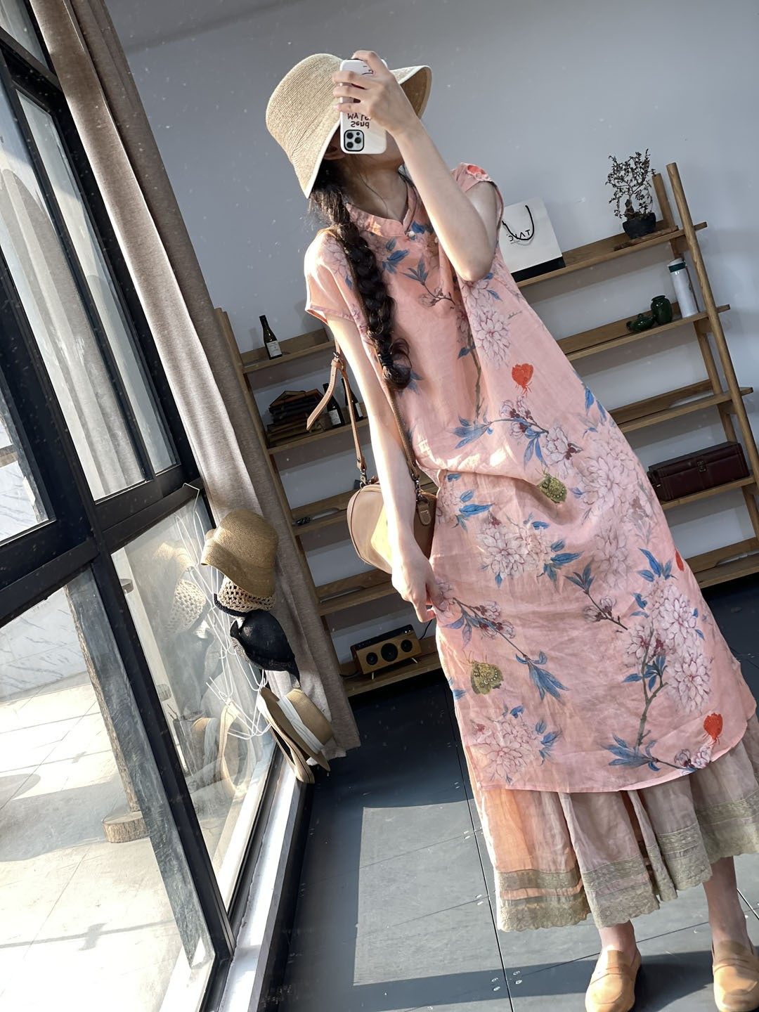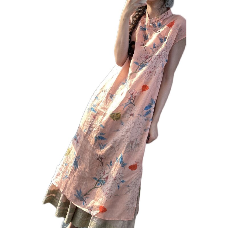 森女修身民族风汉服夏季宽松印花无袖气质显瘦旗袍斜盘扣连衣裙