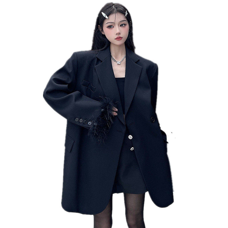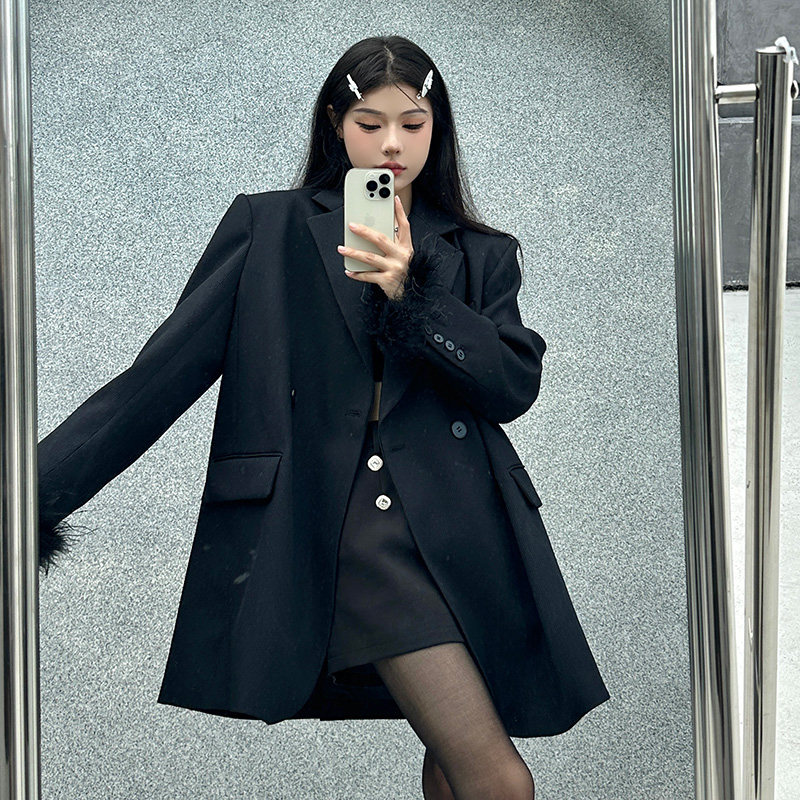法式重工袖口毛毛黑色西装外套轻奢气质中长款高级感休闲宽松西服