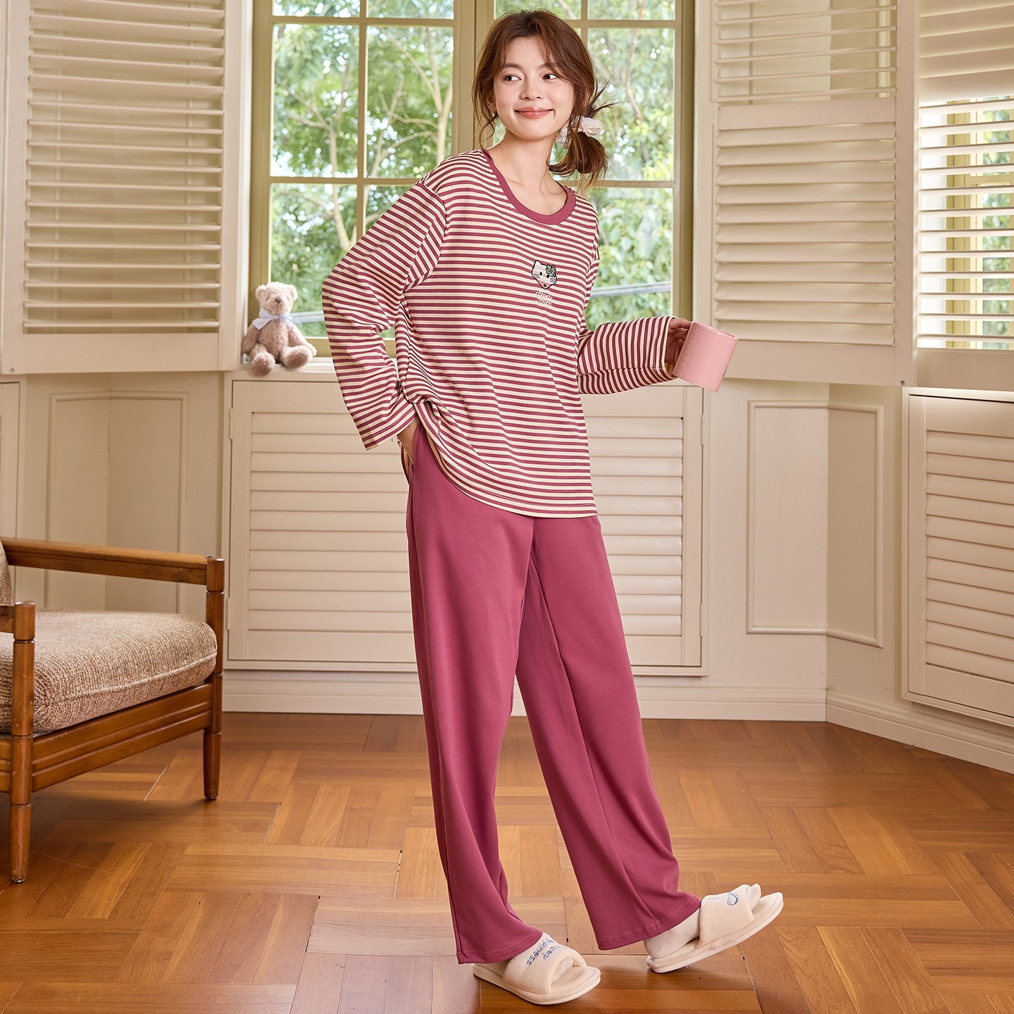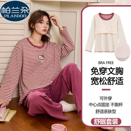 纯棉睡衣女款2025春秋季新款带胸垫长袖休闲条纹女士秋冬款家居服
