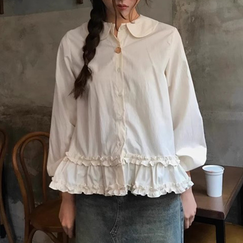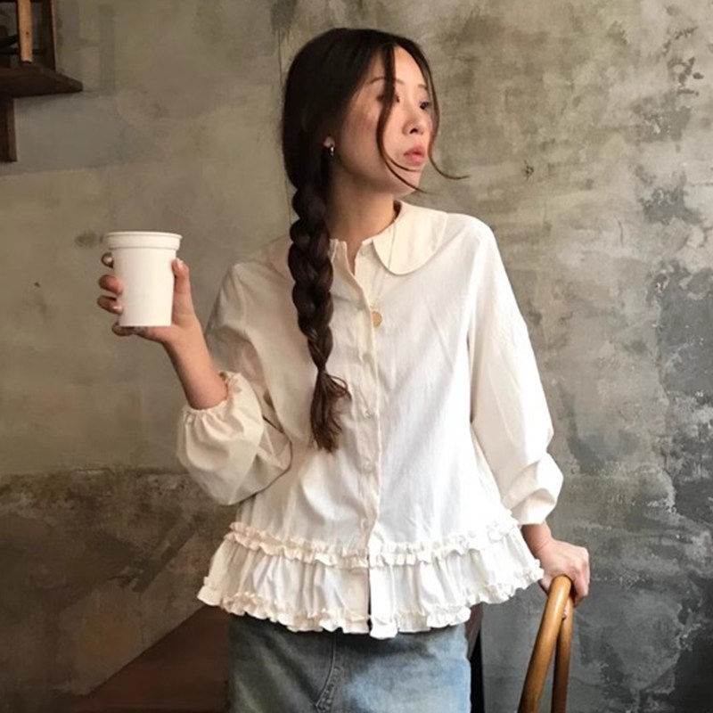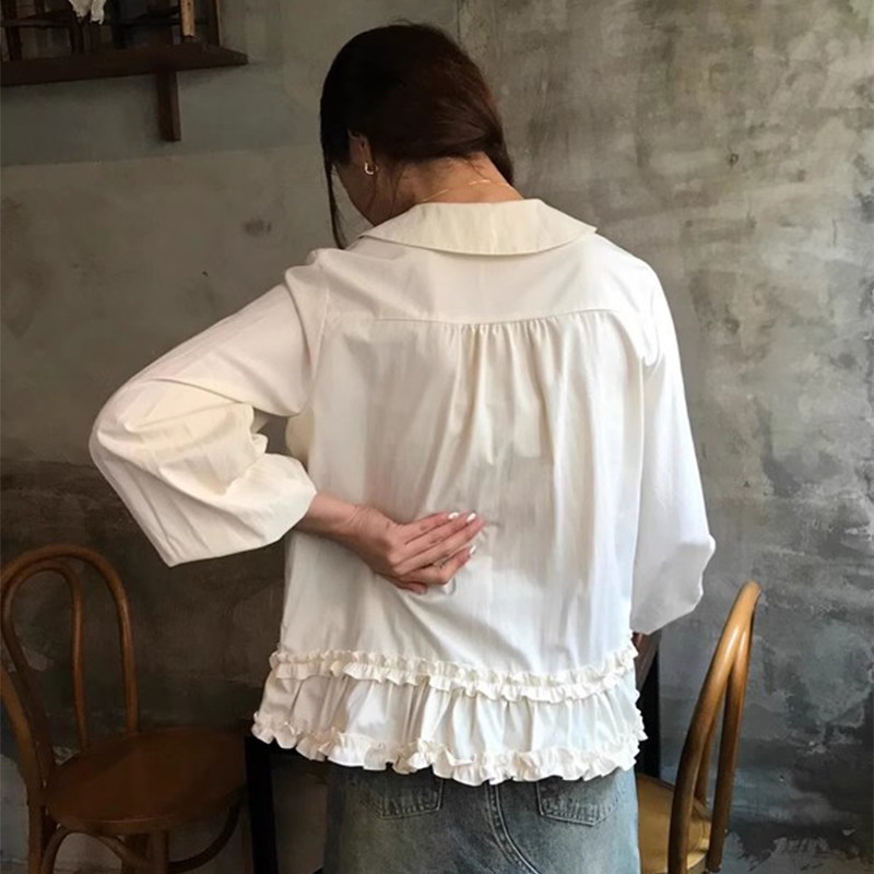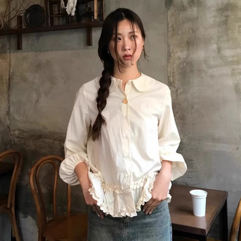 韩国chic春季新款小众设计感娃娃领别致木耳边泡泡袖衬衫上衣女