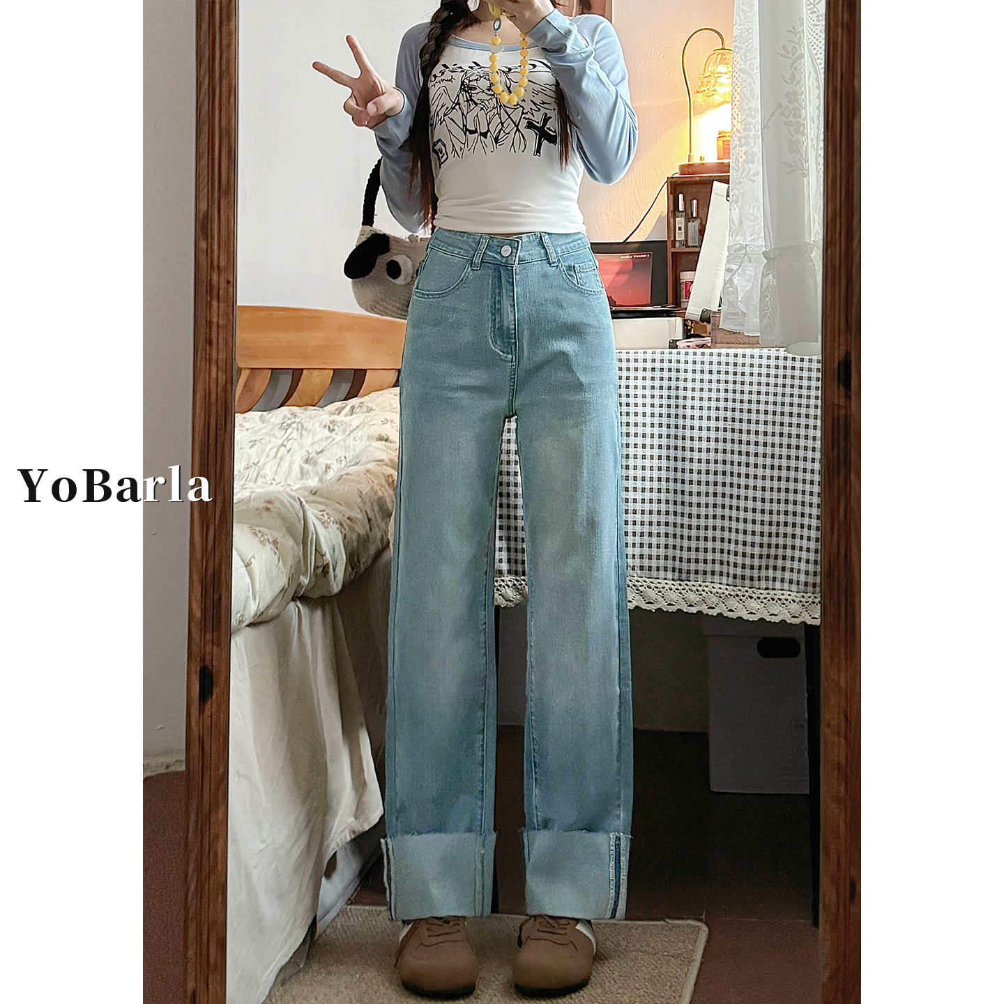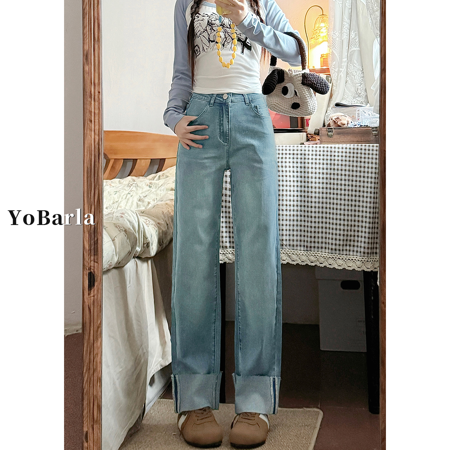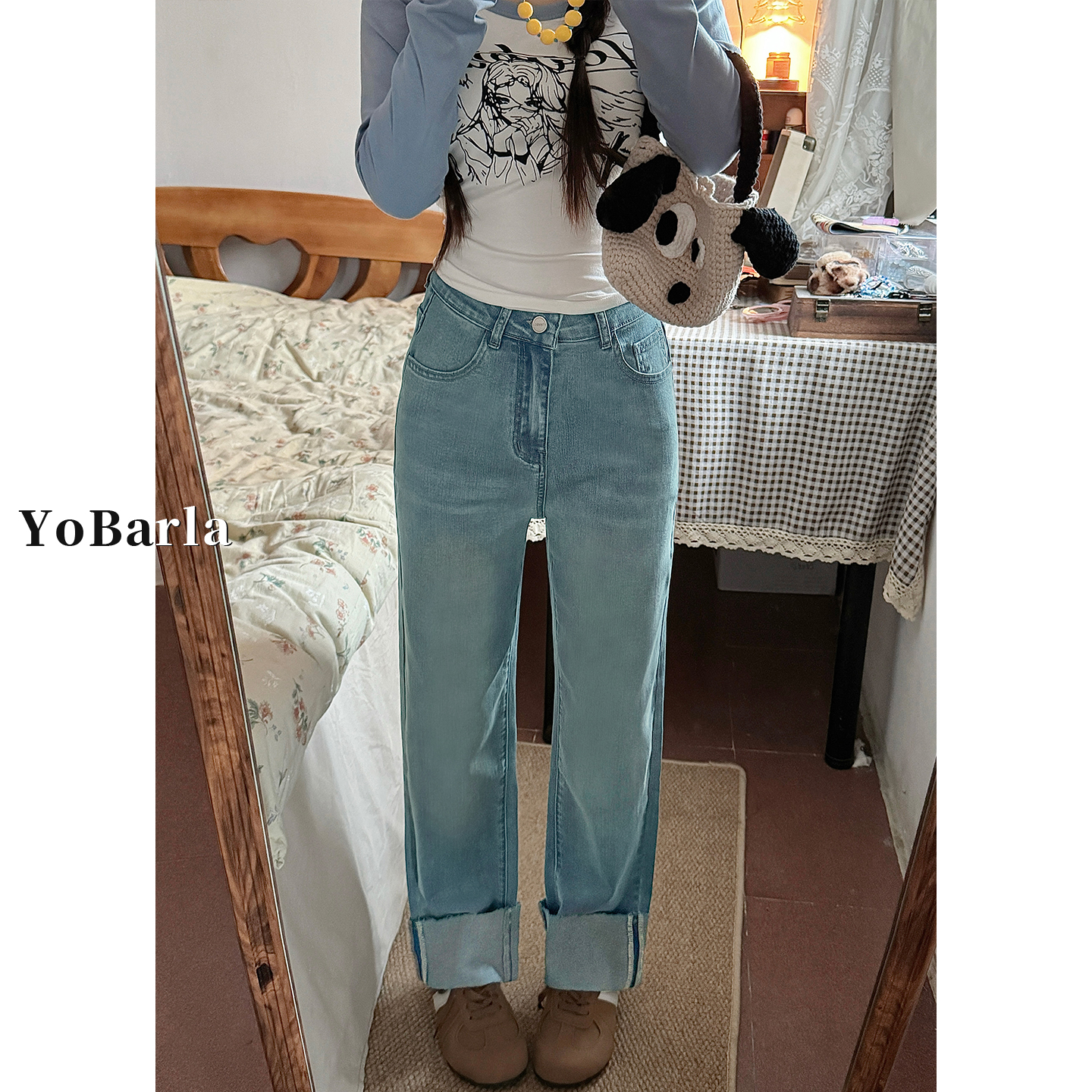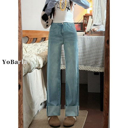 浅色直筒卷边牛仔裤女秋季新款胖mm大码显瘦弹力小个子九分烟管裤