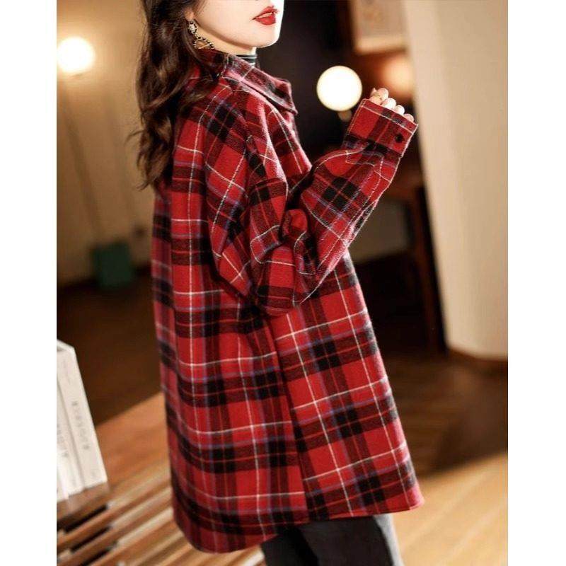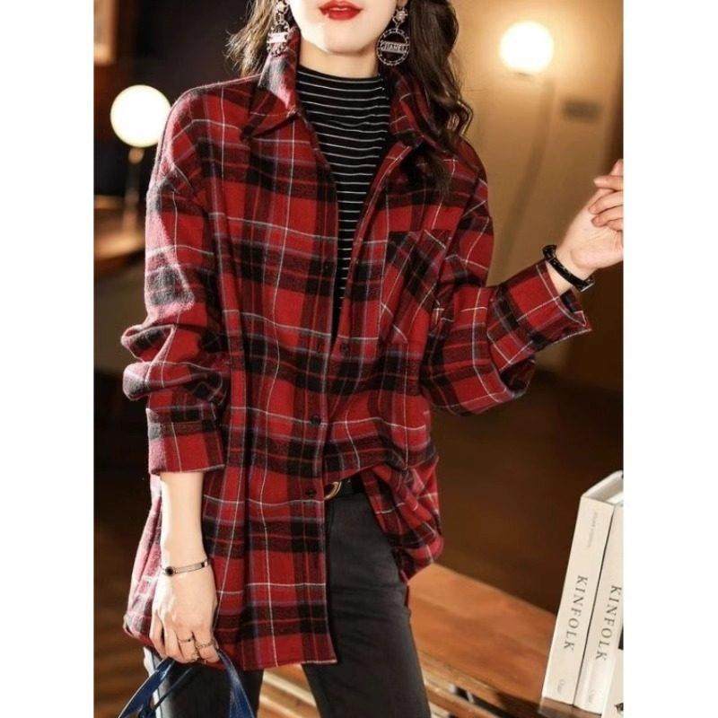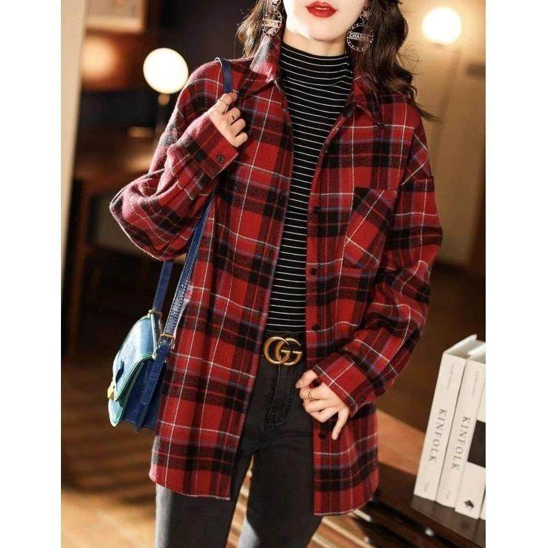 欧洲站磨毛格子衬衫女春秋冬季新款宽松中长款红色长袖叠穿外套潮