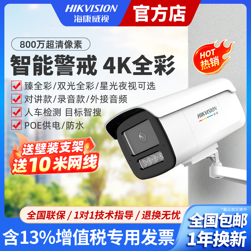 海康威视800万臻全彩4k摄像头3T87高清夜视POE室外远程监控器摄影