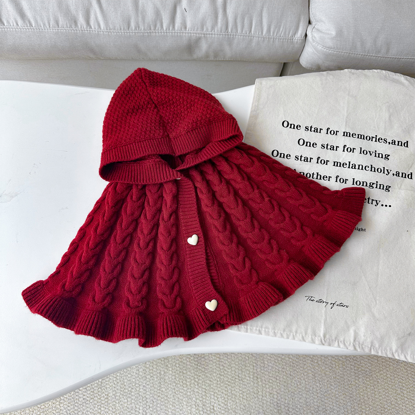 女童春秋季外出披风斗篷冬季宝宝红色洋气小外套披肩针织外出服