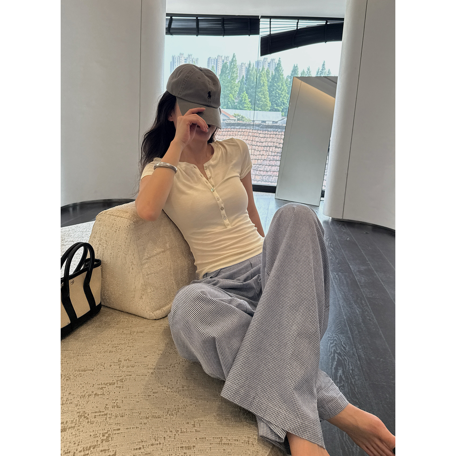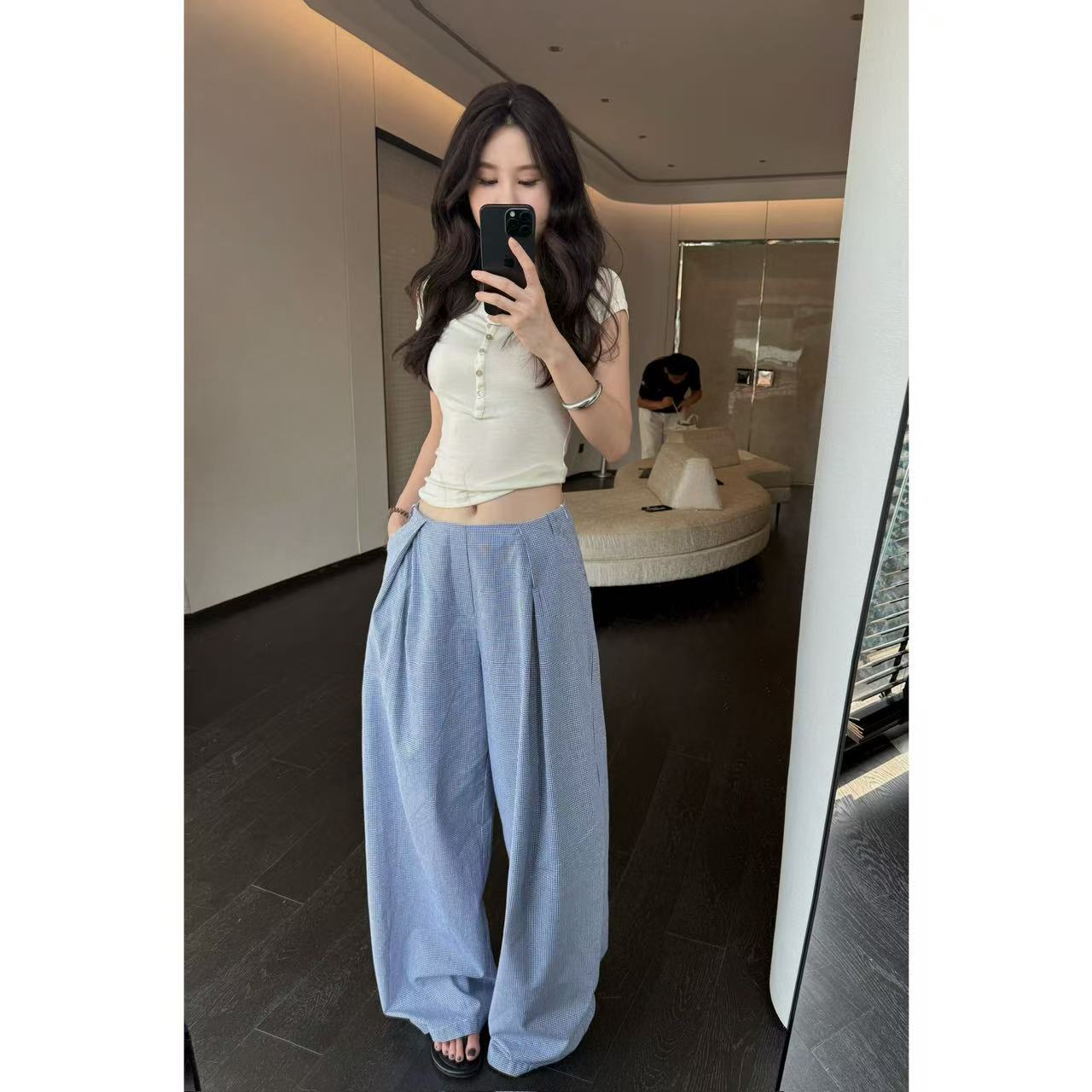 夏日空气感 垂垂雾蓝格休闲裤女春夏百搭宽松显瘦阔腿裤透气速干