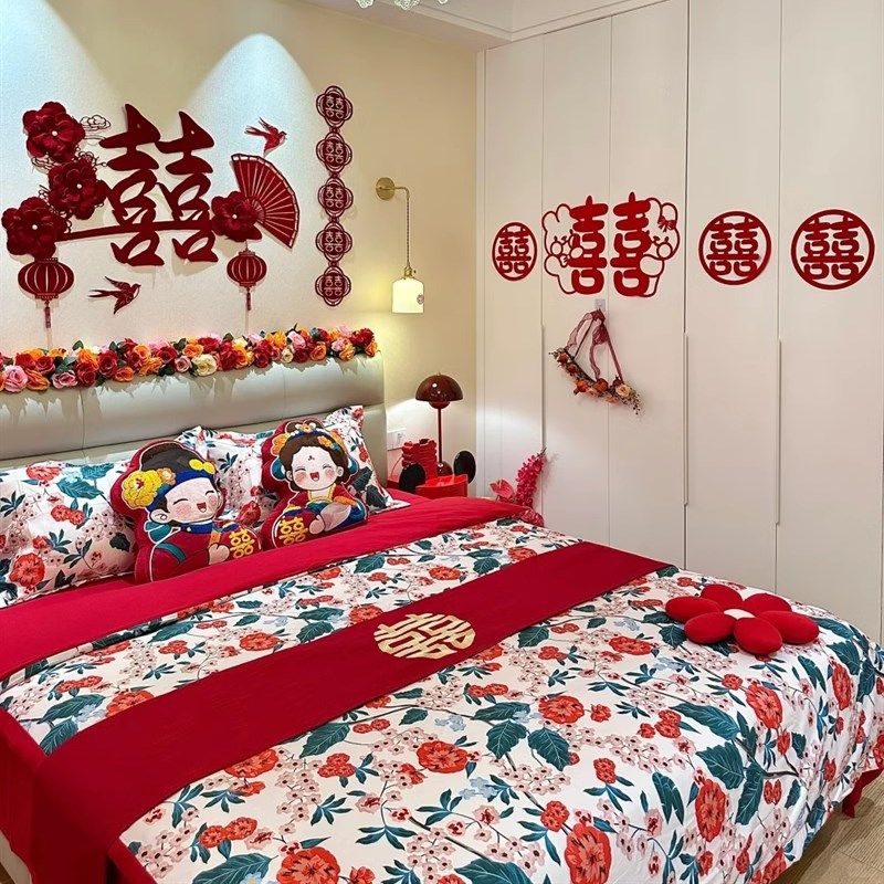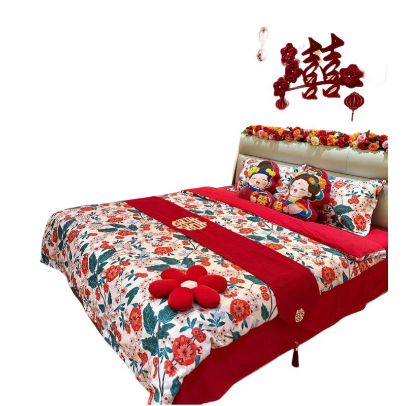 简约印花100支婚庆四件套2025新款红色被L套新婚床单结婚床上用品