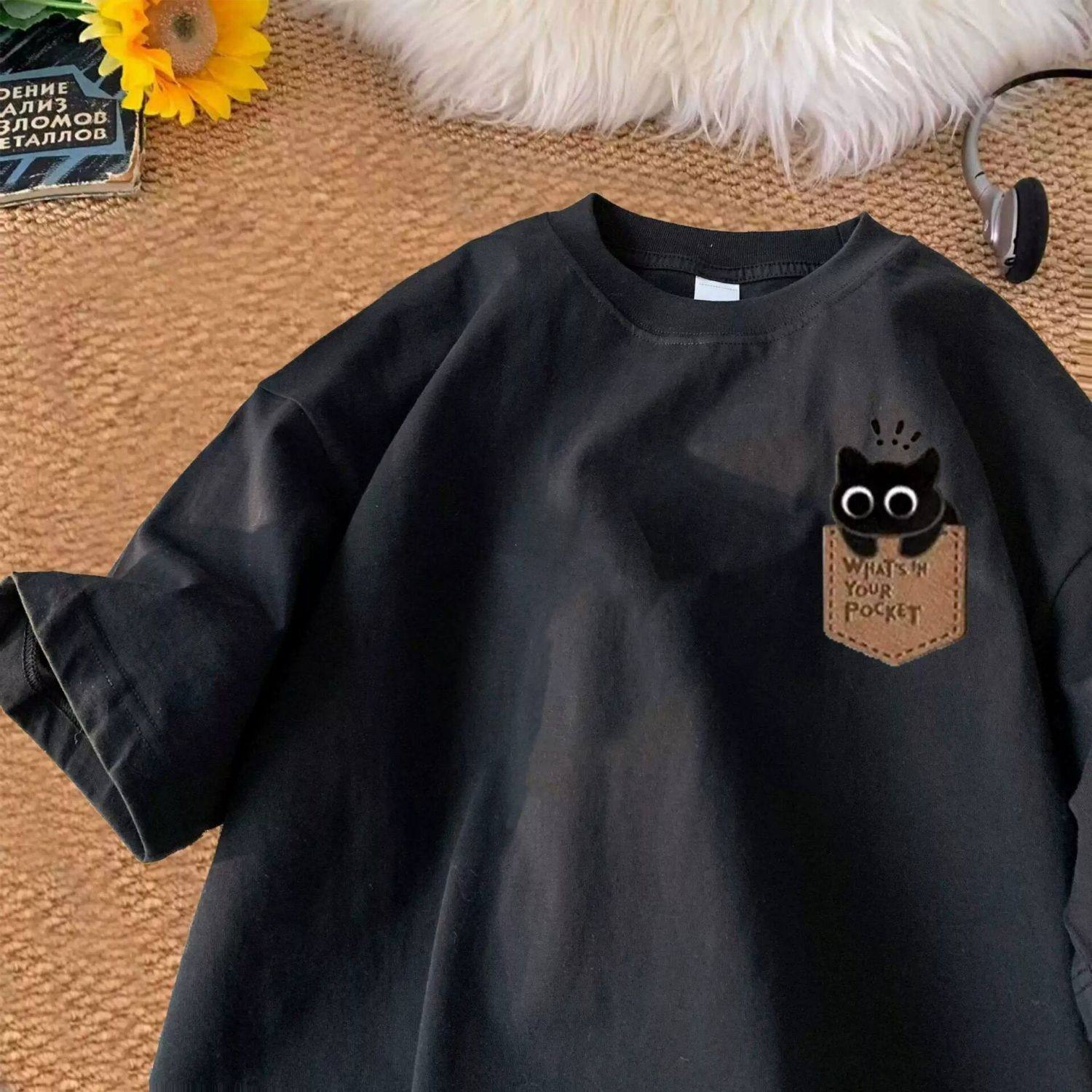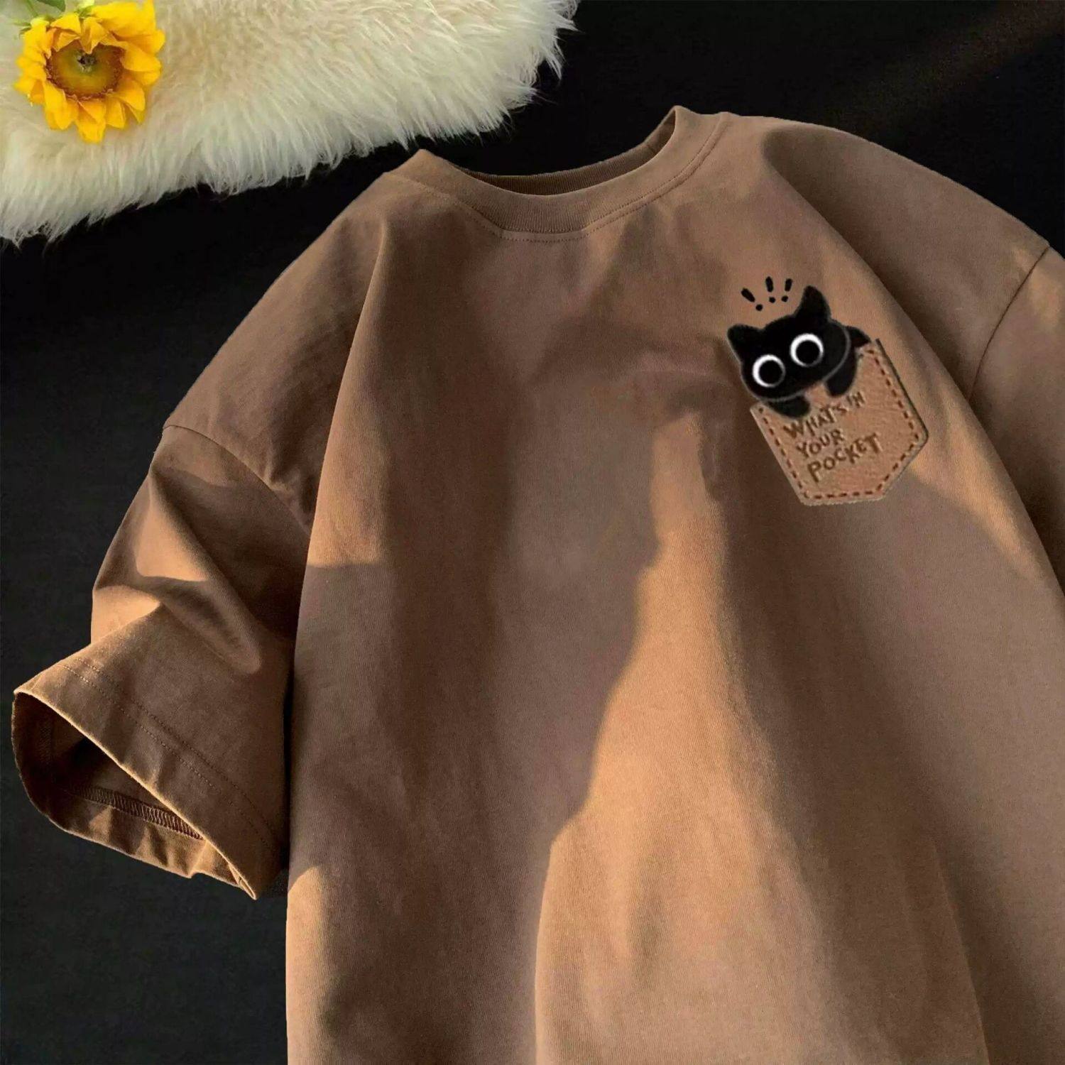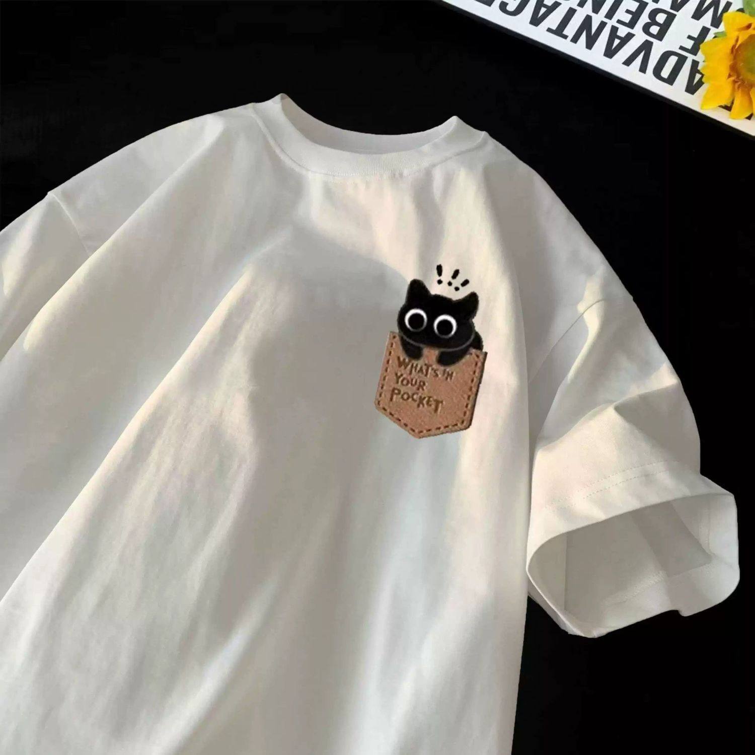 重磅纯棉港风复古卡通小猫印花短袖T恤男女夏季百搭ins宽松体恤衫