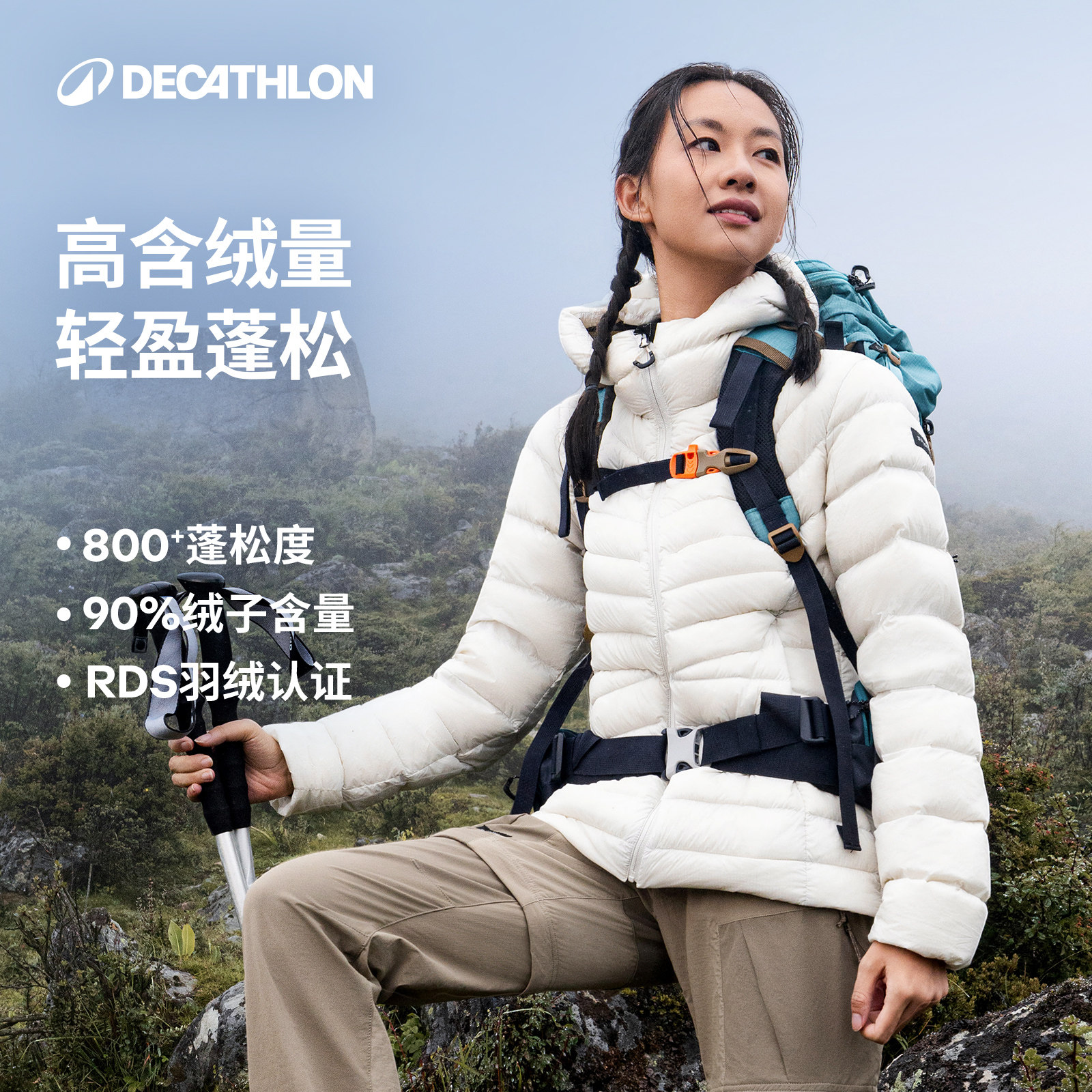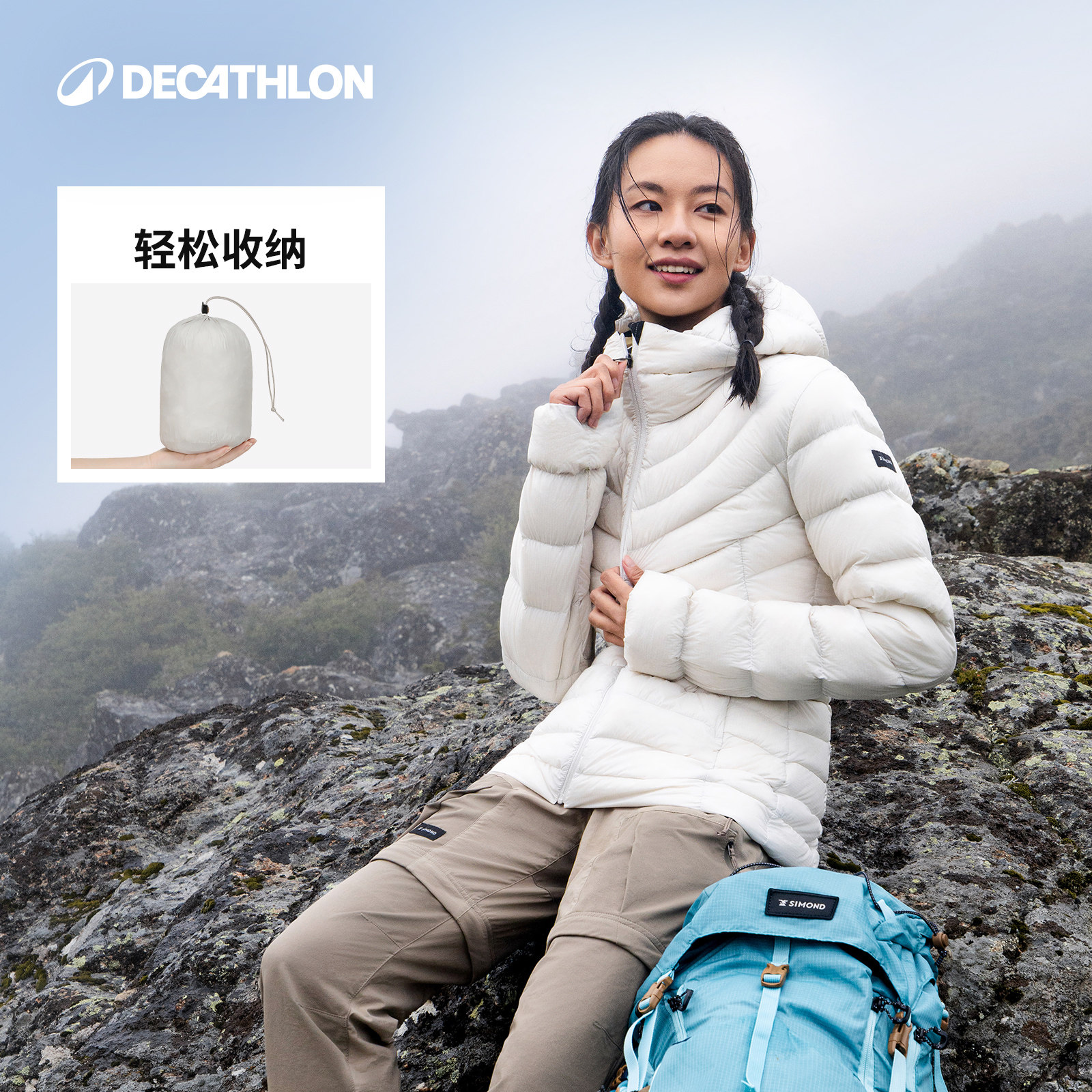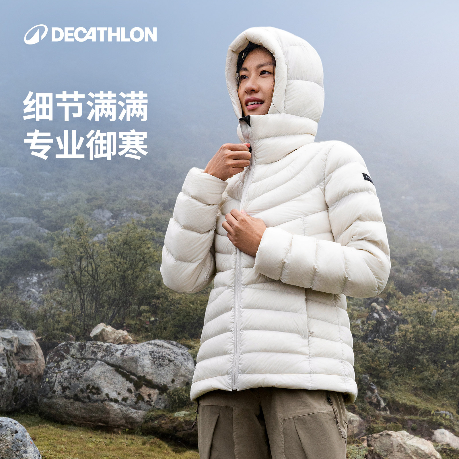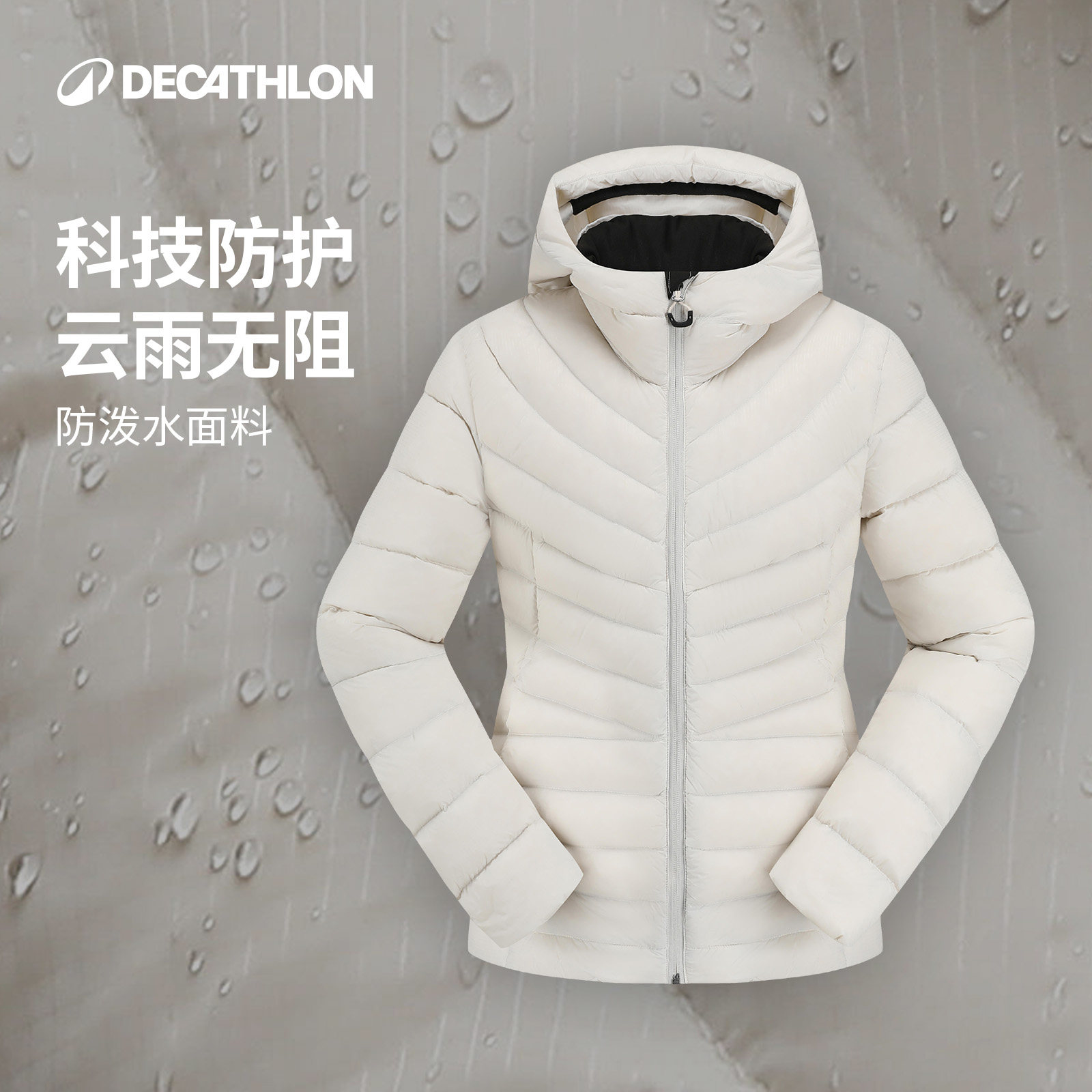 迪卡侬户外防泼水连帽羽绒服