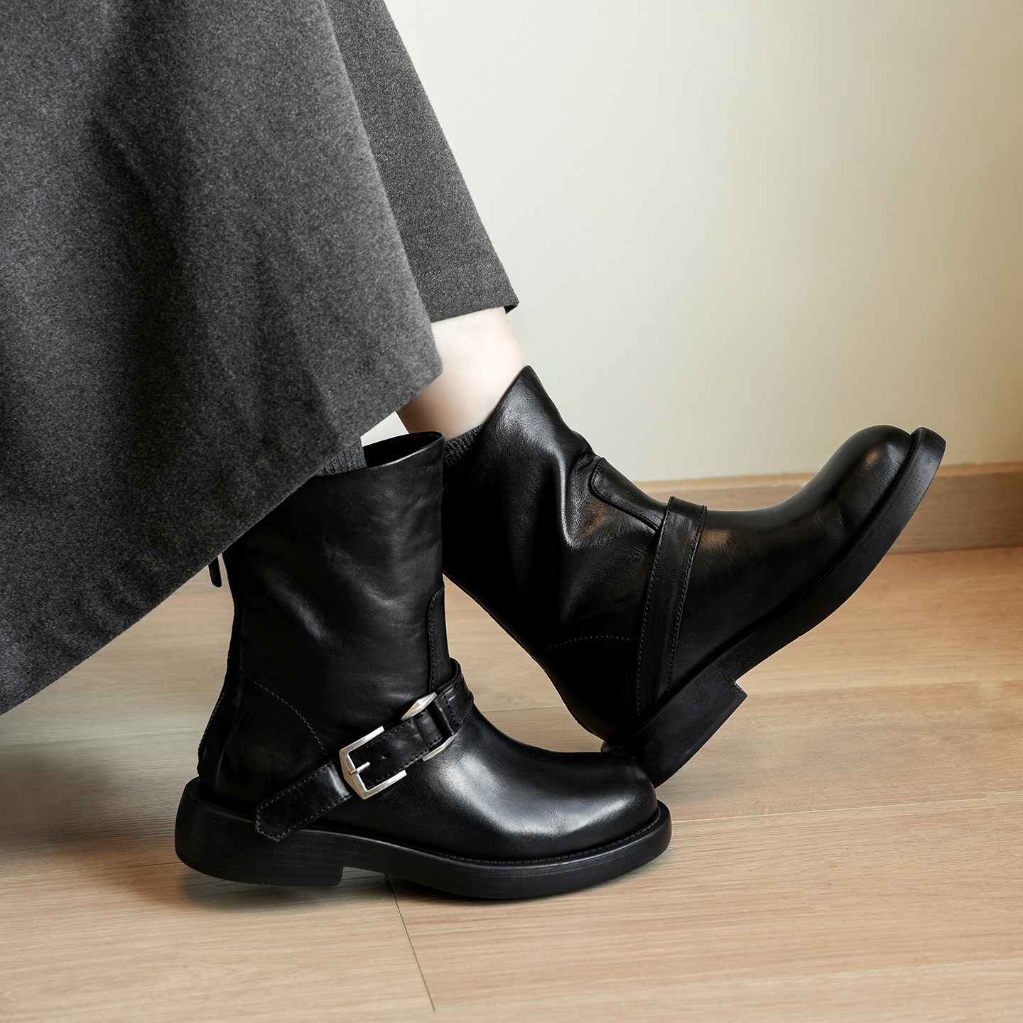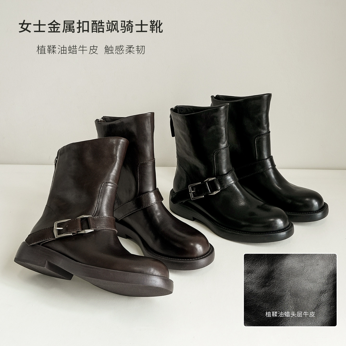 植鞣油蜡牛皮 金属扣酷飒骑士靴 女士圆头拉链短靴 冬季女鞋k