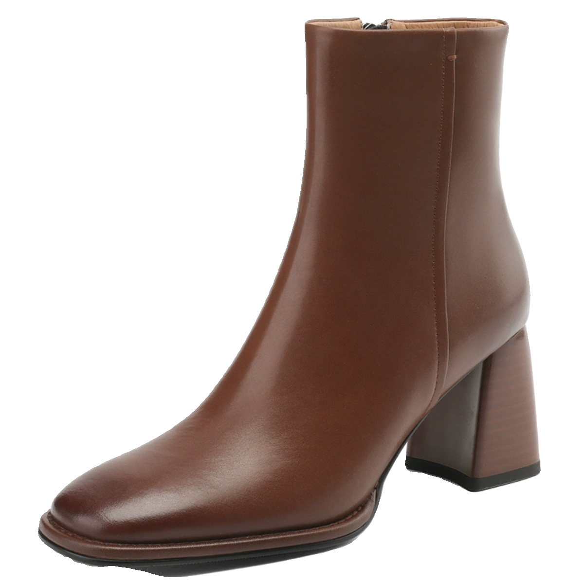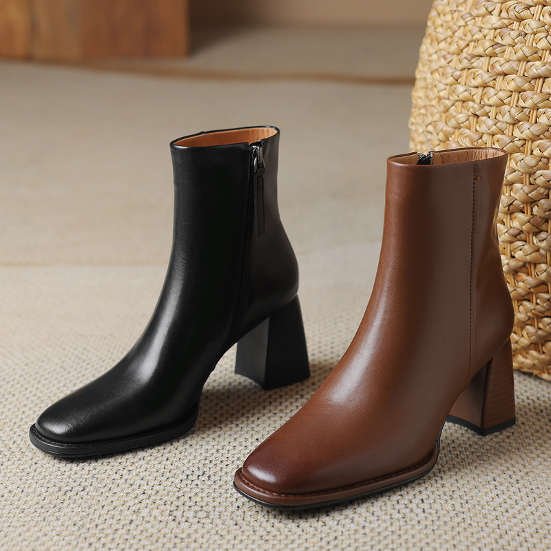复古真皮高跟短靴女牛皮方头高级感马丁靴加绒靴子女2023新款秋冬