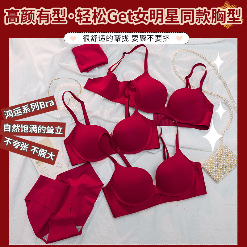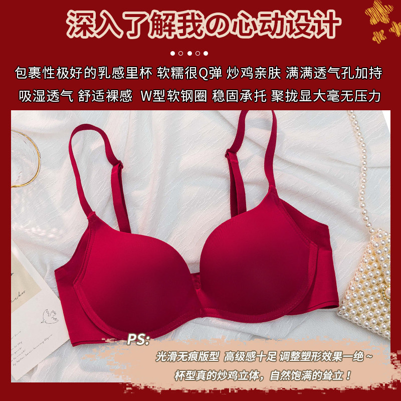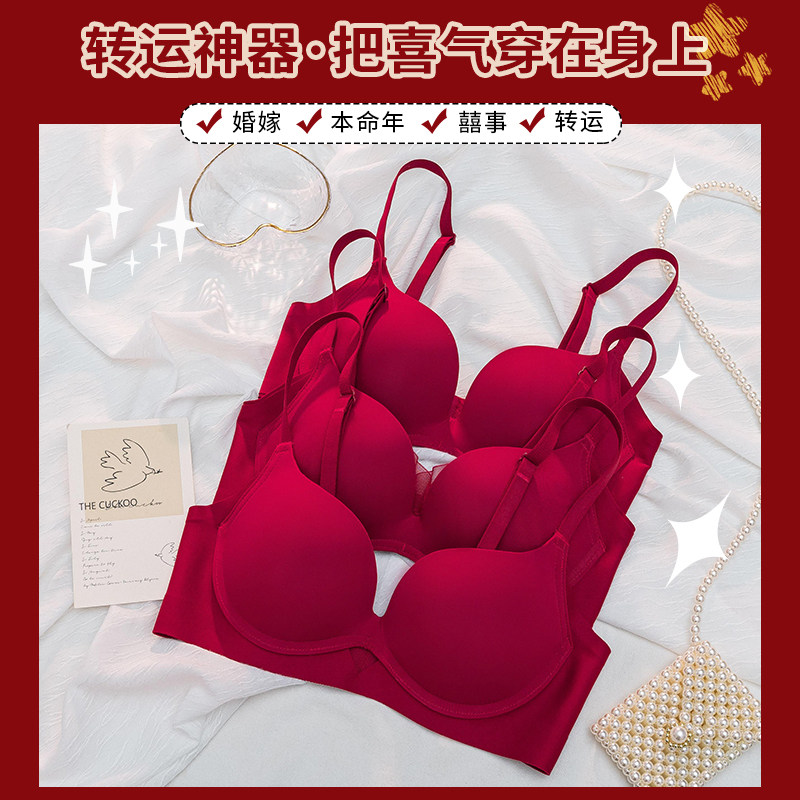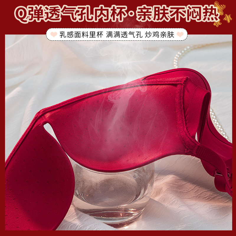红色本命年内衣女薄款大胸显小防下垂软钢圈光面小胸聚拢文胸套装