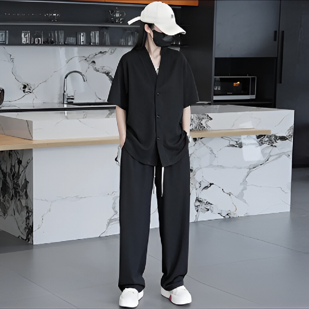 夏季薄款透气垂感V领短袖衬衫长裤两件套男士高级感纯色休闲套装