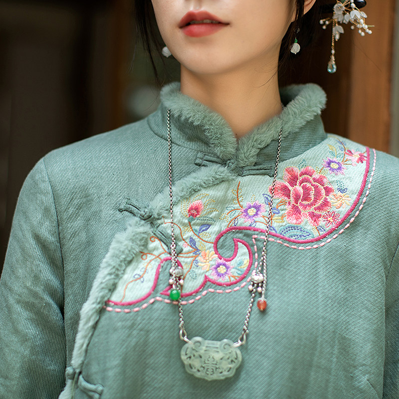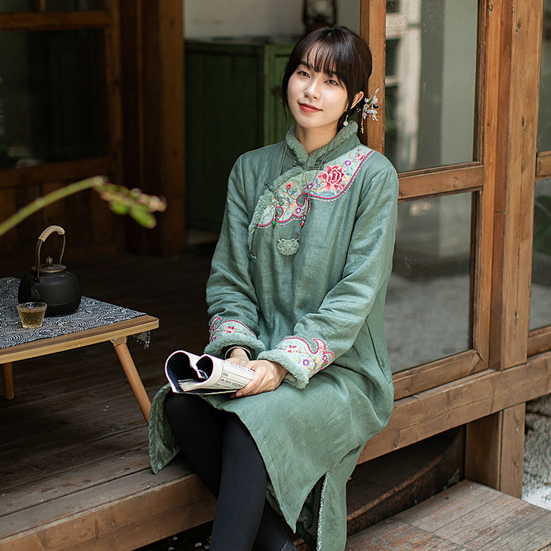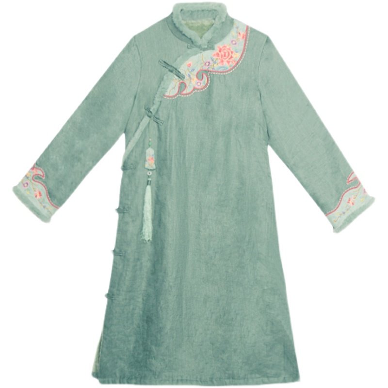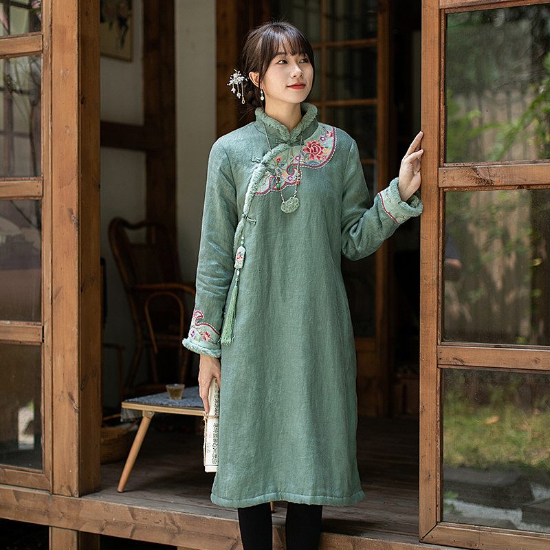 远镇冬加绒连衣裙中国风女装亚麻棉衣盘扣中式棉服茶服加厚旗袍裙