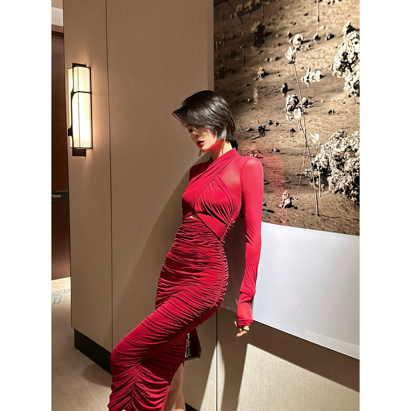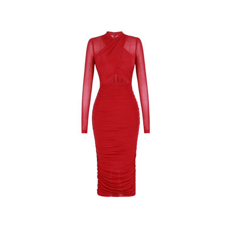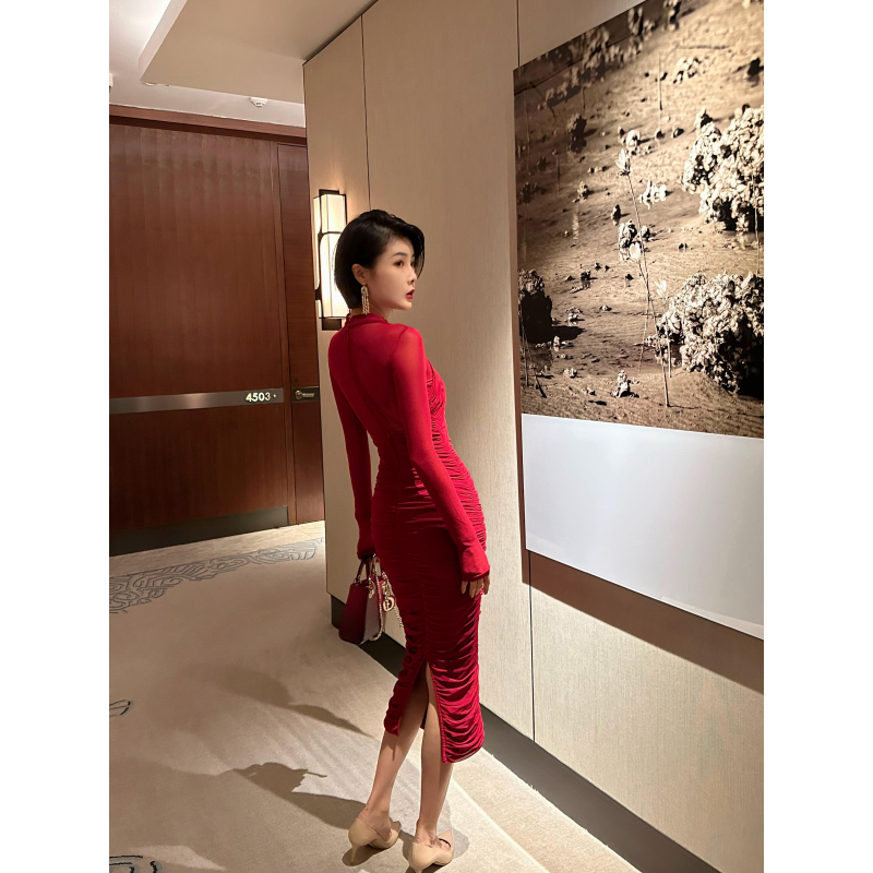 XULU原创秋季亲肤弹力韩国网纯色褶皱时尚气质修身长袖V领连衣裙