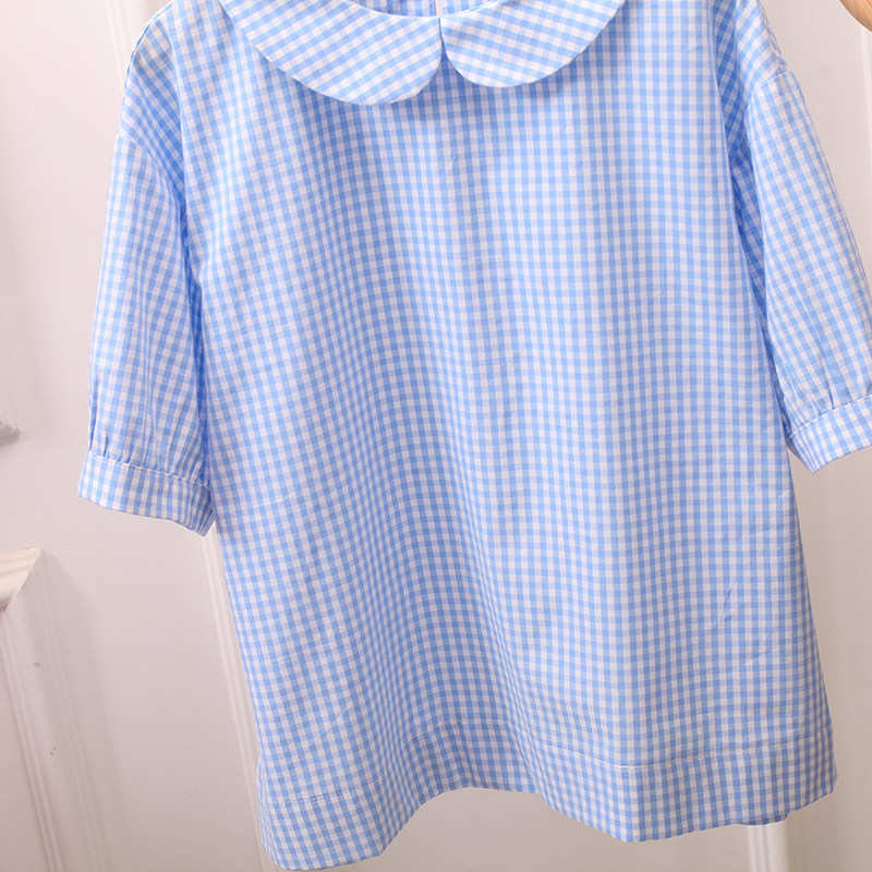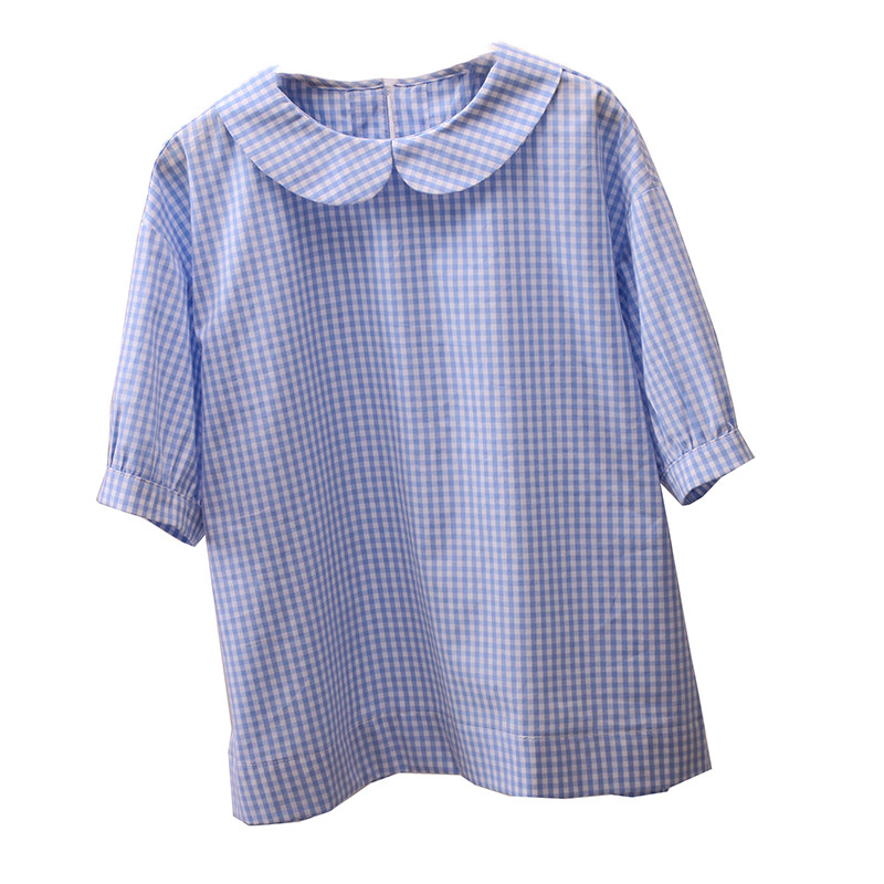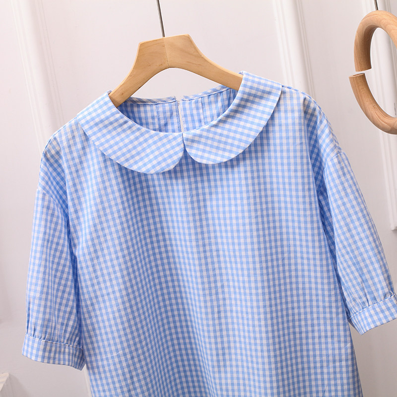 夏季新款日系甜美可爱娃娃领格子短袖衬衫女宽松显瘦百搭上衣大码