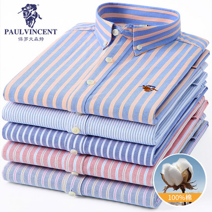 保罗100%纯棉男士条纹牛津纺长袖衬衫中青年休闲全棉大码衬衣男装