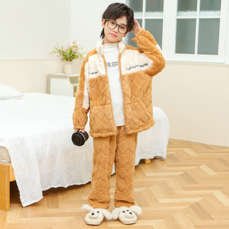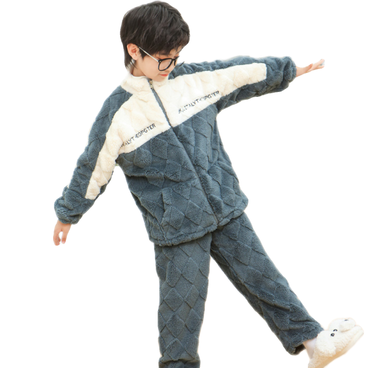 男童家居服套装秋冬中大童保暖宽松拼色儿童睡衣小男孩法兰绒冬装