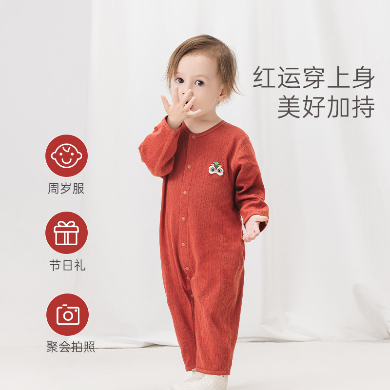 宝宝连体衣夏季薄款婴儿红色喜庆周岁礼满月纯棉哈衣爬服空调服