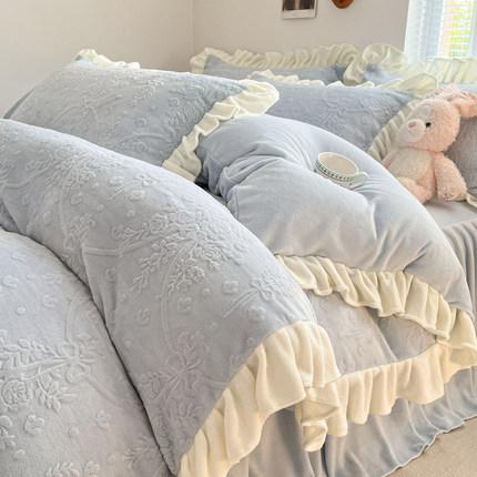 秋冬季公主风花边牛奶绒四件套