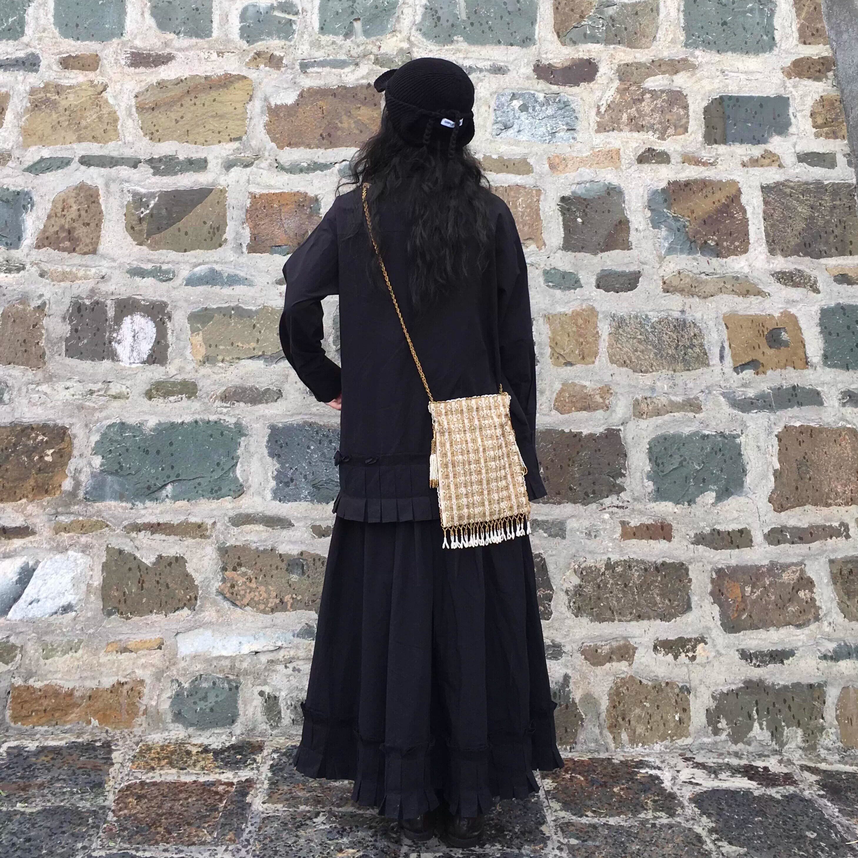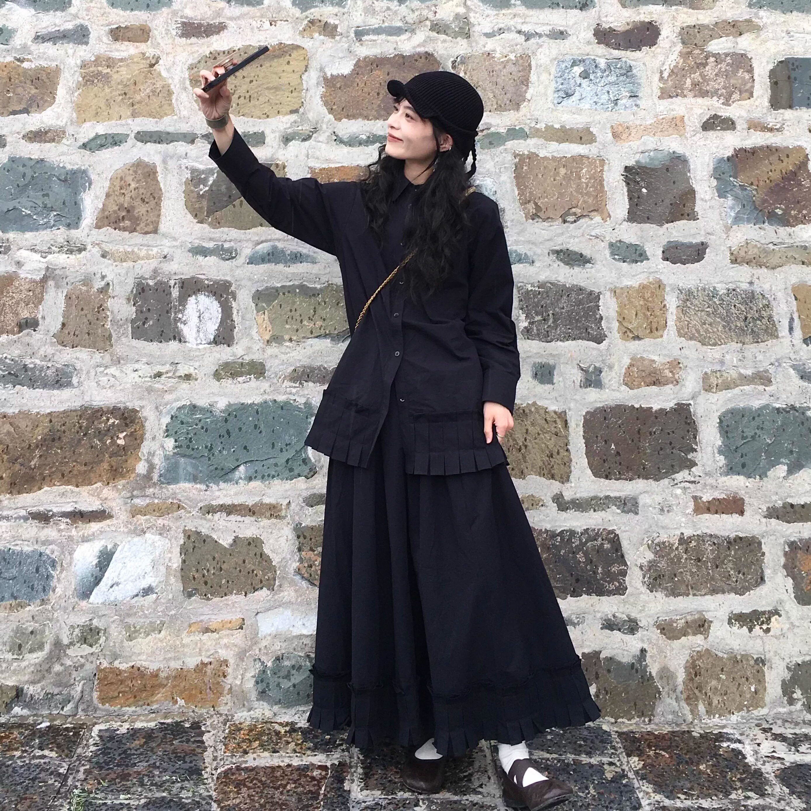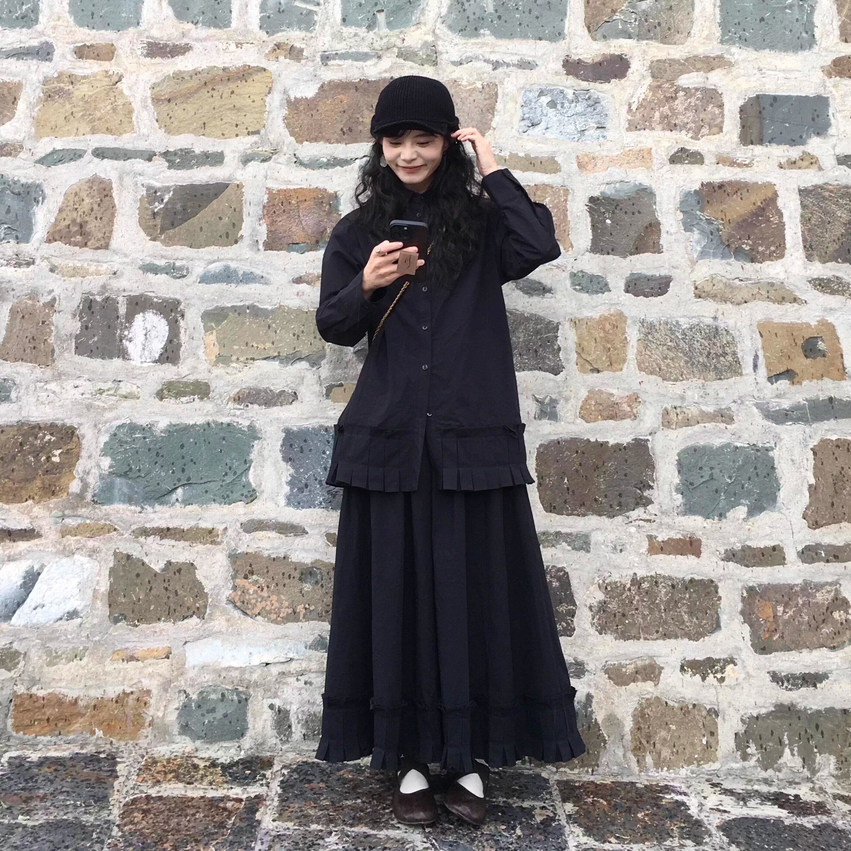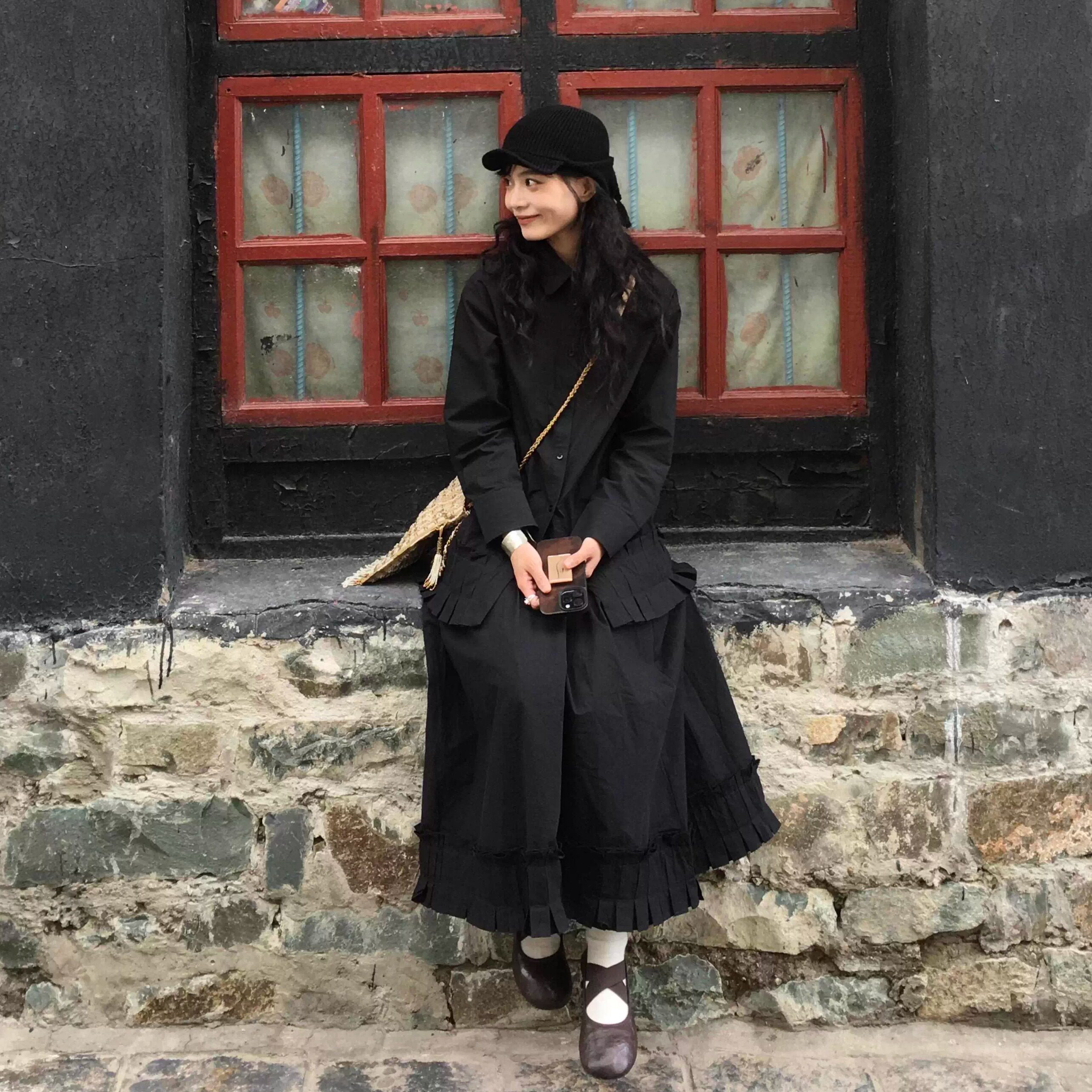 2025新款秋冬山本风复古日系小众压褶花边设计感黑色长袖衬衫套装