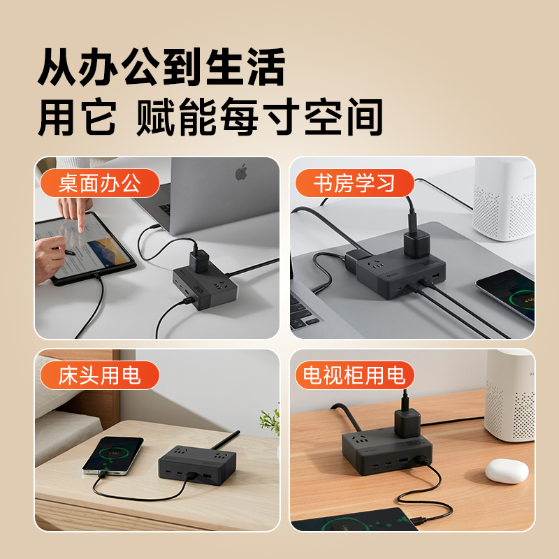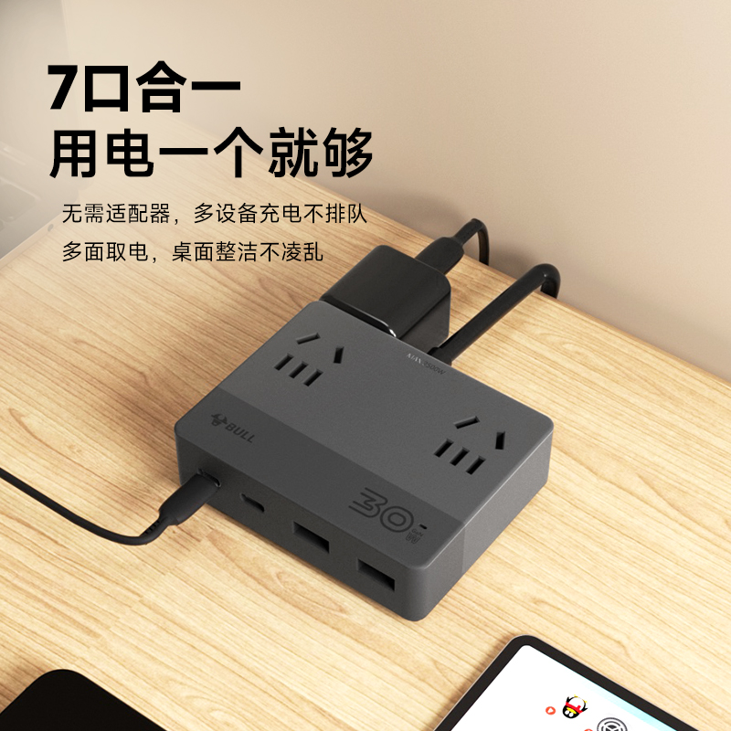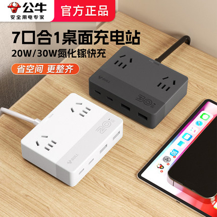 公牛扁平插座氮化镓多孔usb面板小巧延长线67w快充办公桌面充电站
