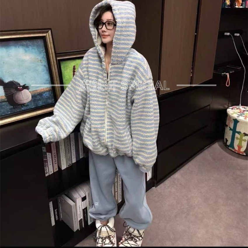 摇粒绒条纹外套女2025新款秋冬连帽拉链宽松撞色软糯上衣欧洲站q