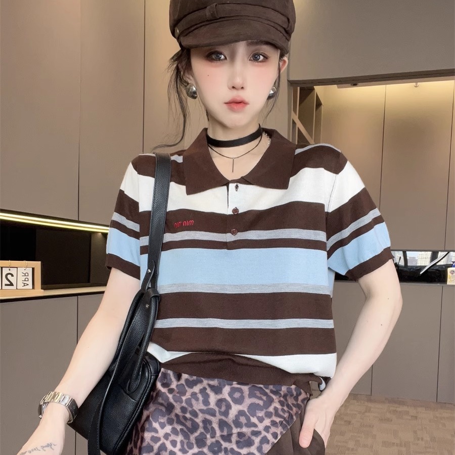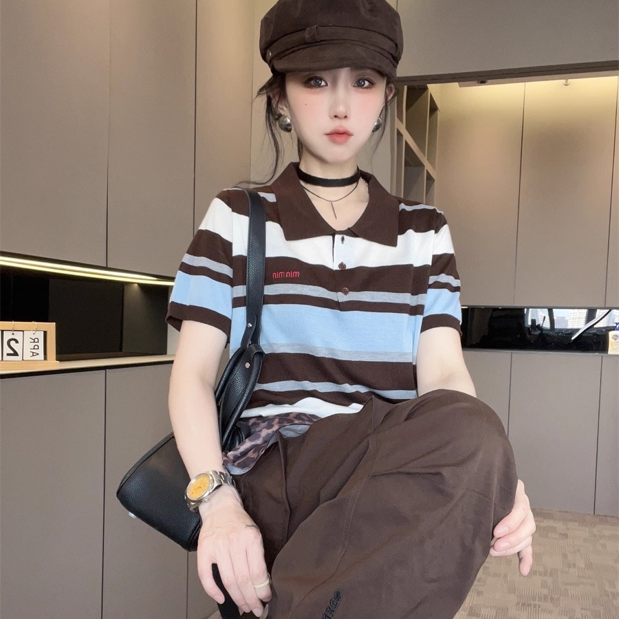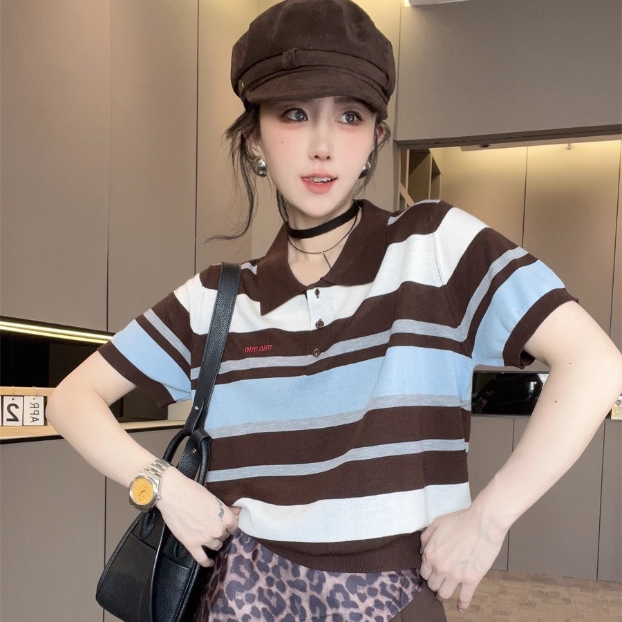 撞色条纹POLO衫短袖T恤女2025新款秋翻领半袖洋气欧货潮时髦上衣