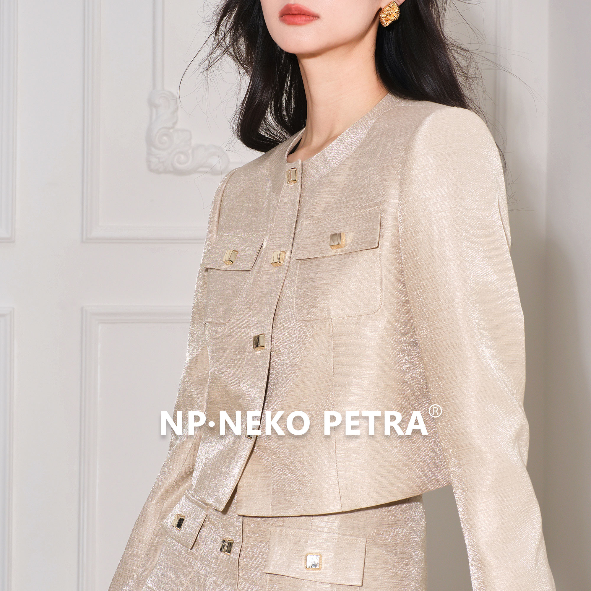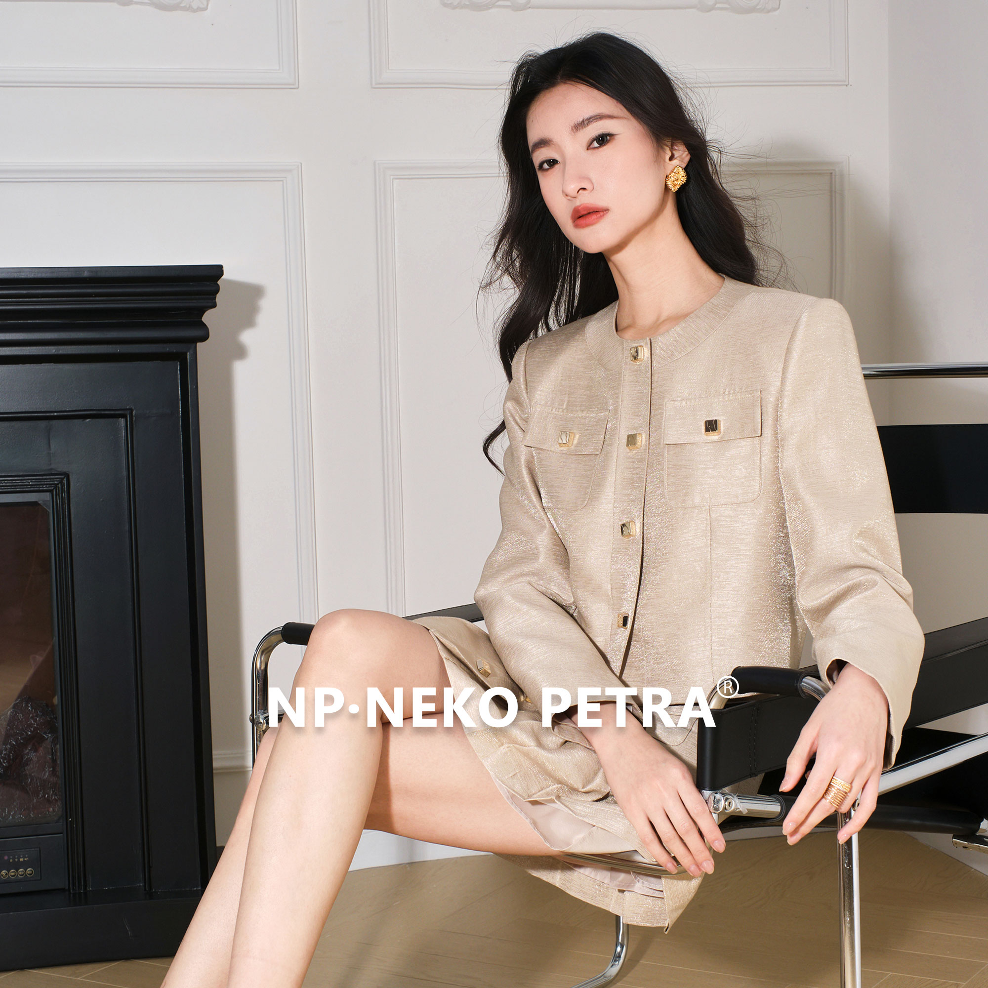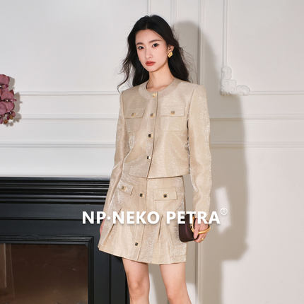 Neko Petra高级光泽感金杏色小香风西装套装裙女春秋轻奢两件套裙
