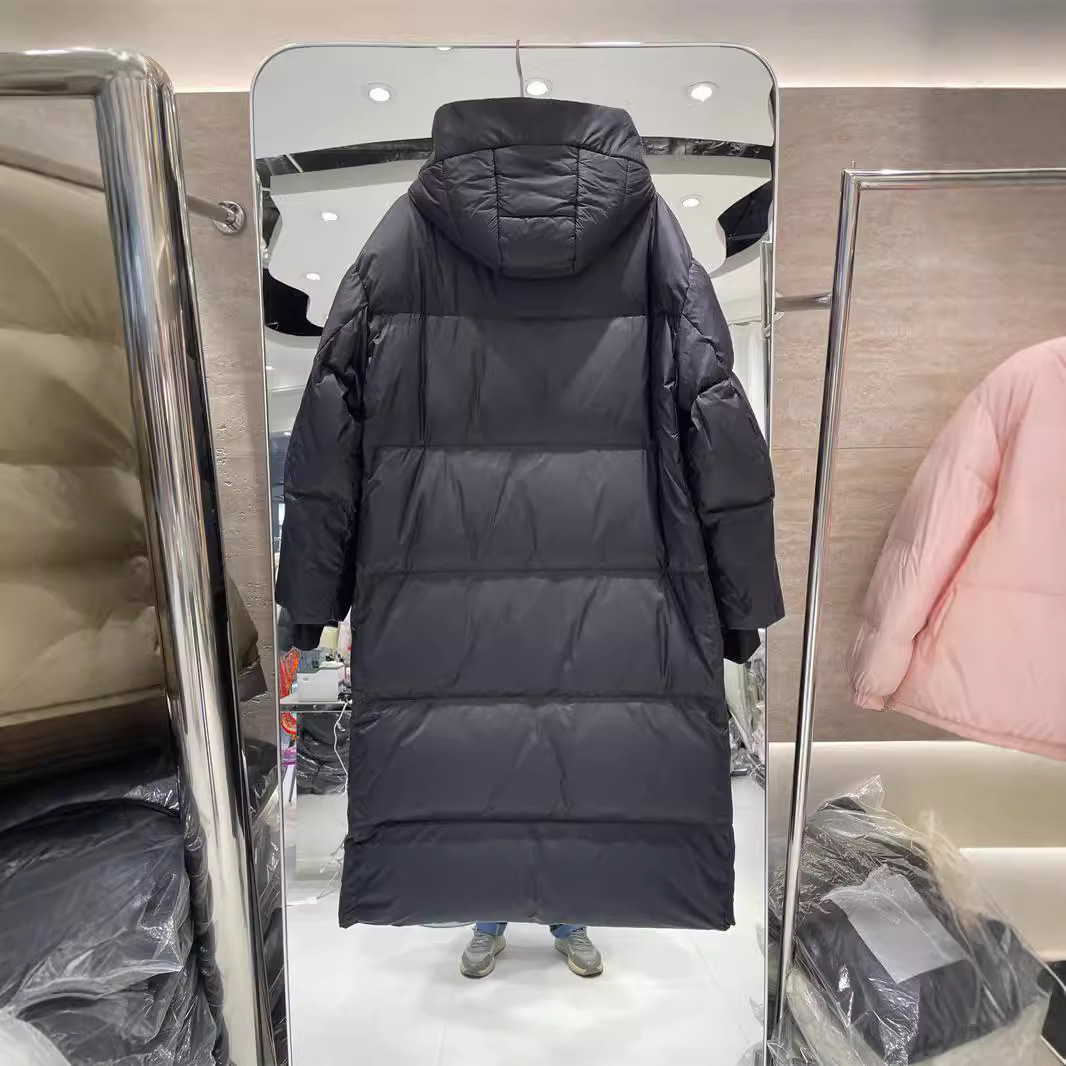 黑金鸭绒长款羽绒服女冬季2025新款宽松东北加厚连帽保暖过膝外套