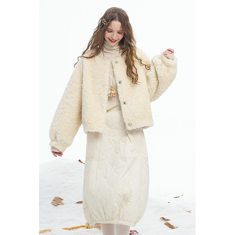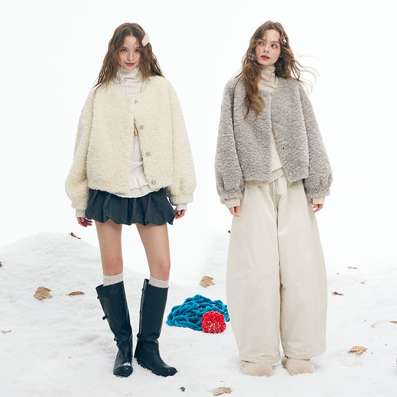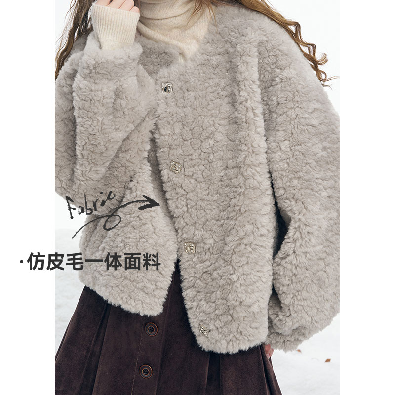 妖精的口袋韩系圆领毛绒绒外套女2025年冬季新款皮毛一体短款上衣