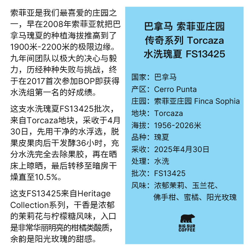 BIG SUR 25巴拿马 索菲亚庄园 传奇系列 Torcaza 水洗瑰夏FS13425