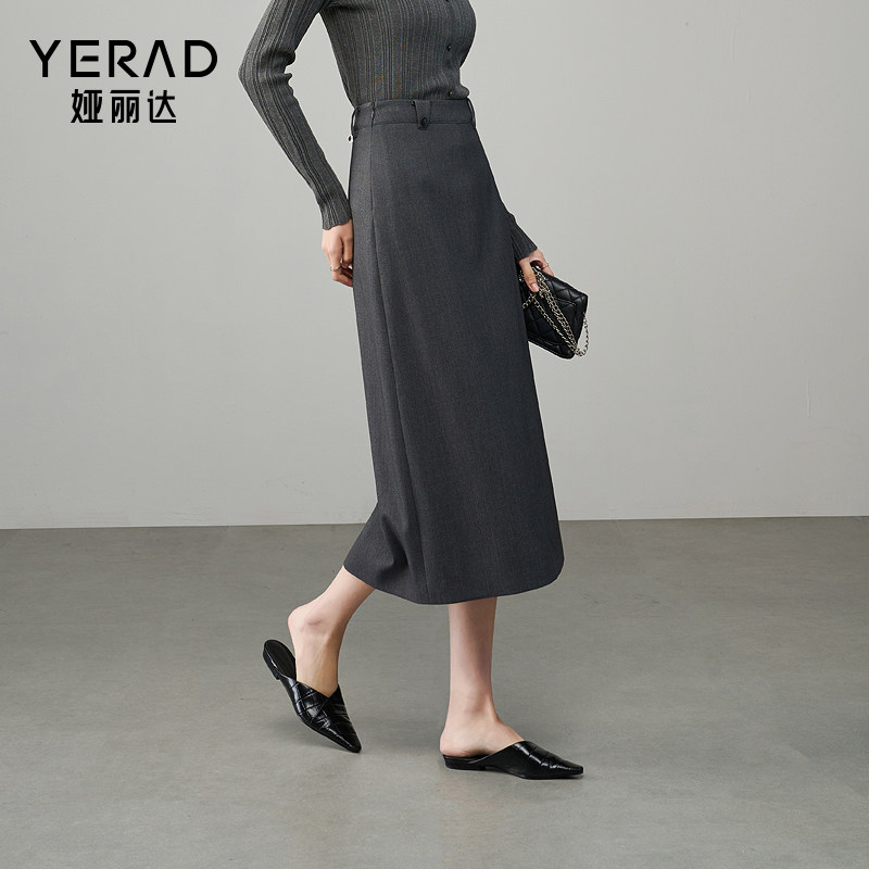 娅丽达高腰气质深灰色半身裙女春季2024新款长裙通勤开叉直筒裙子