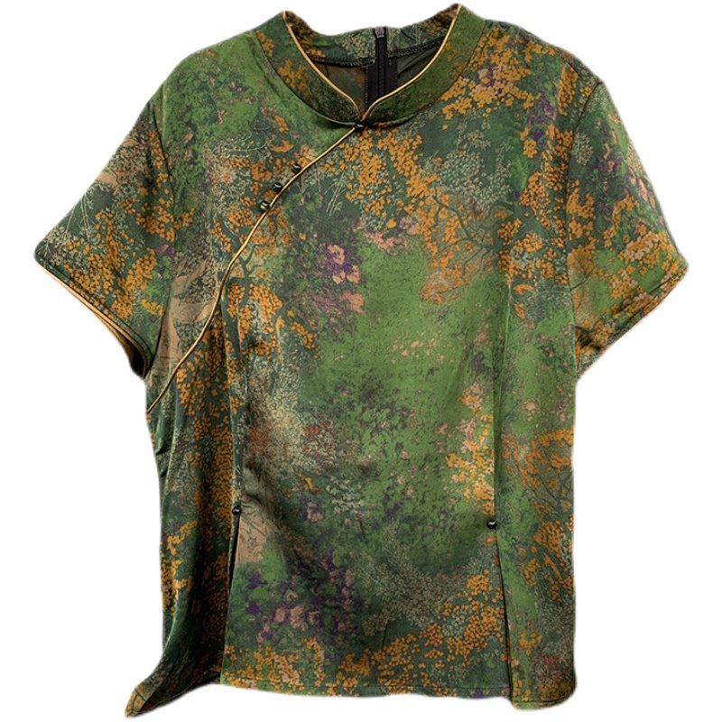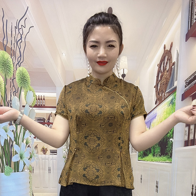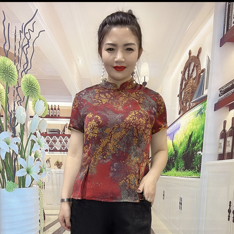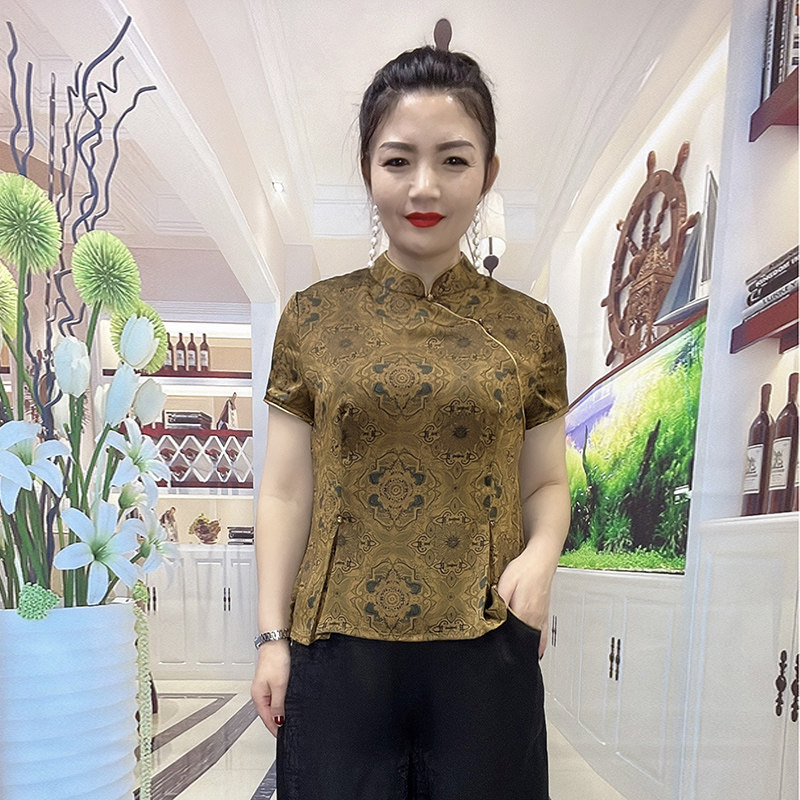 真丝体恤夏季新款中老年妈妈桑蚕丝复古改良旗袍衫修身显瘦短上衣