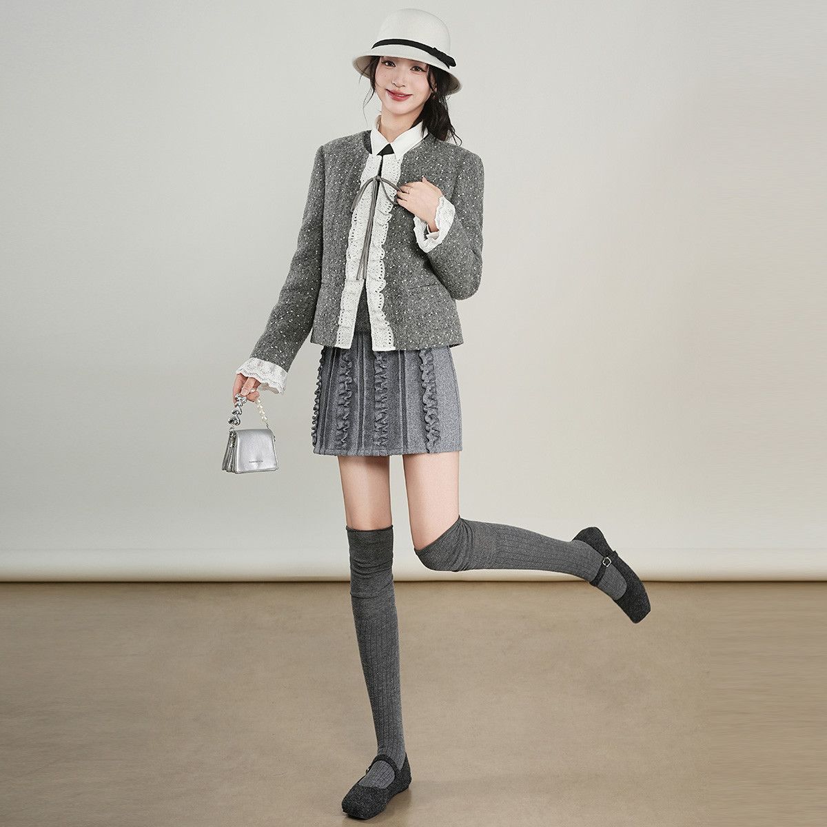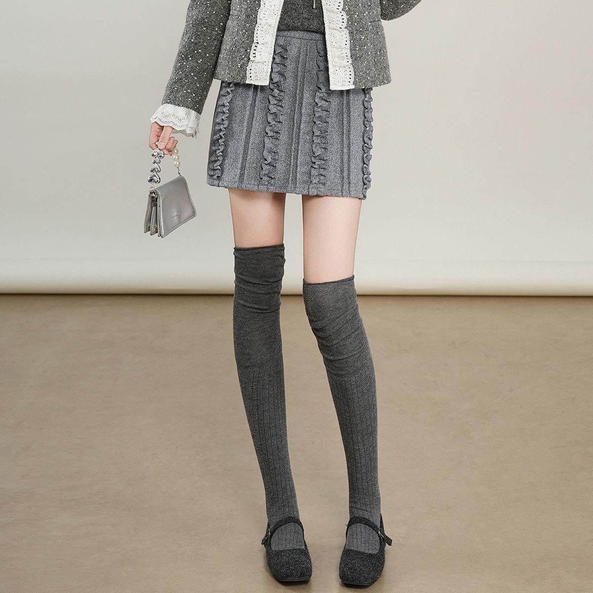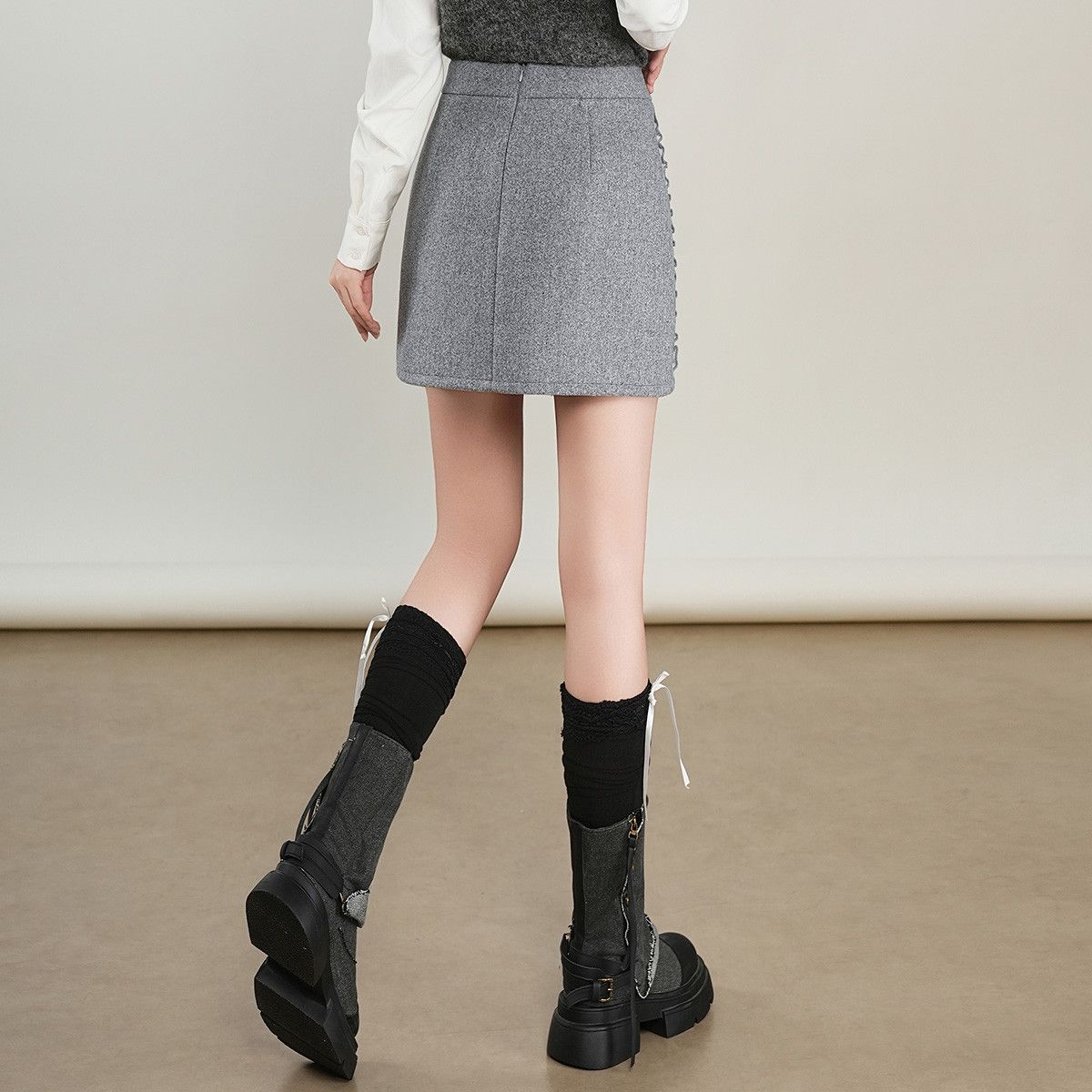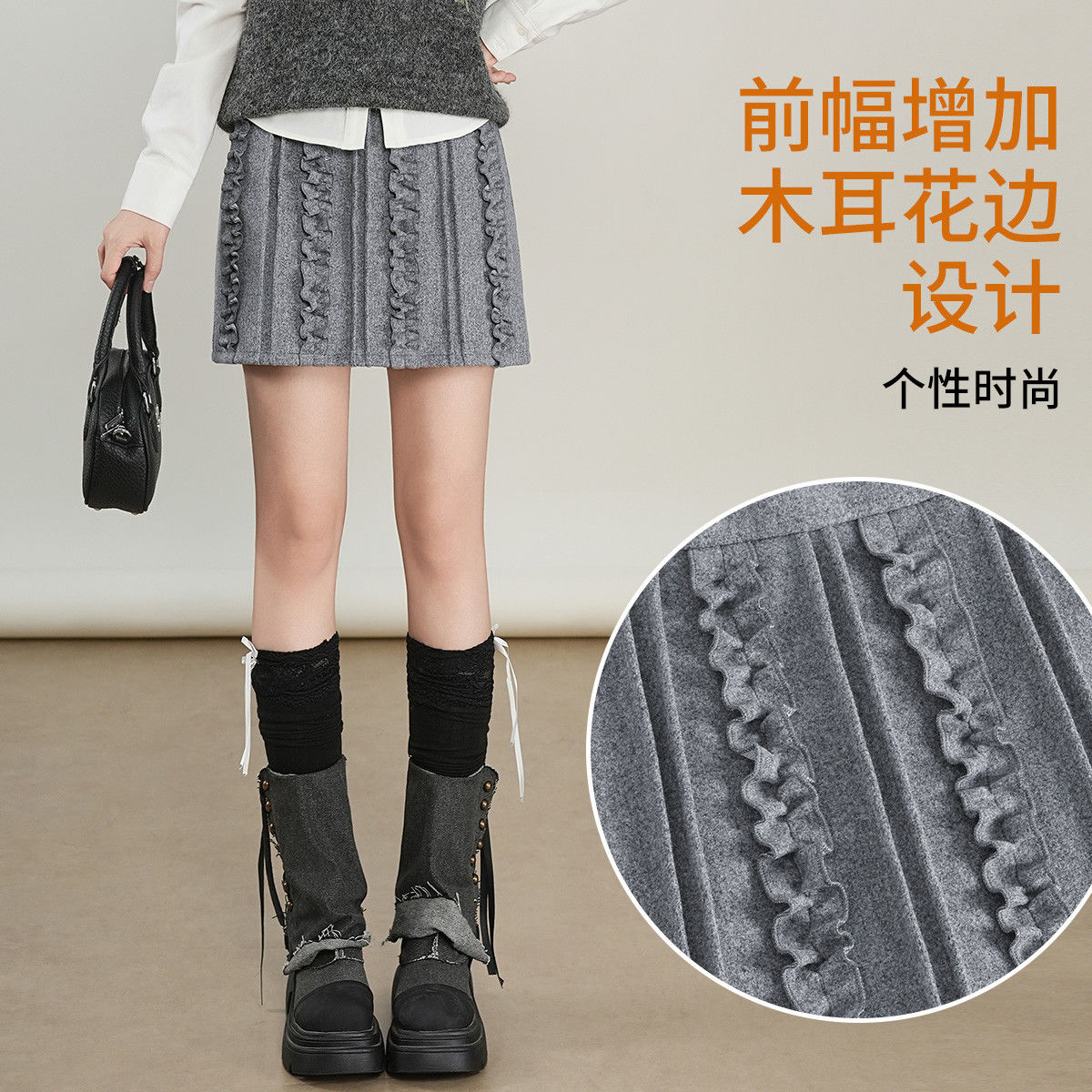 白鹿语甜辣木耳边拼接毛呢半身裙25秋冬新款高腰显瘦A字包臀短裙