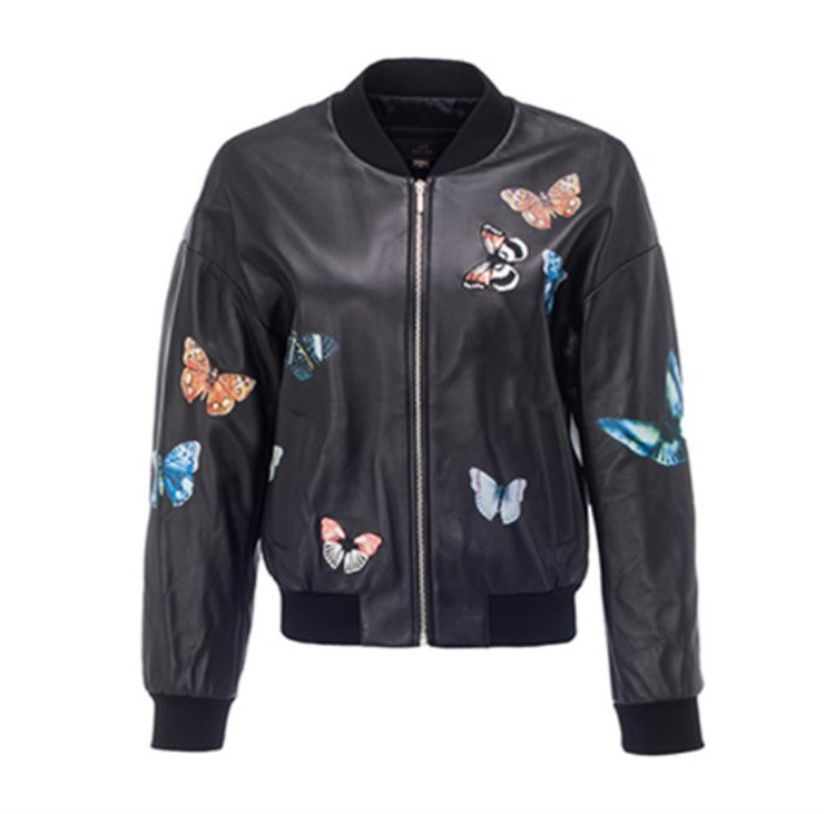 彩印蝴蝶风油画印刷万针刺绣蝴蝶女绵羊皮真皮皮衣皮夹克棒球服