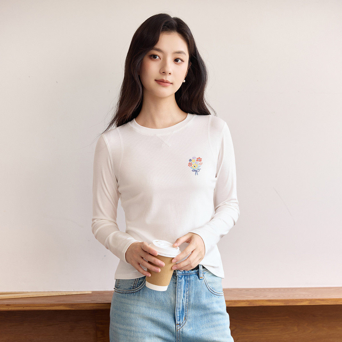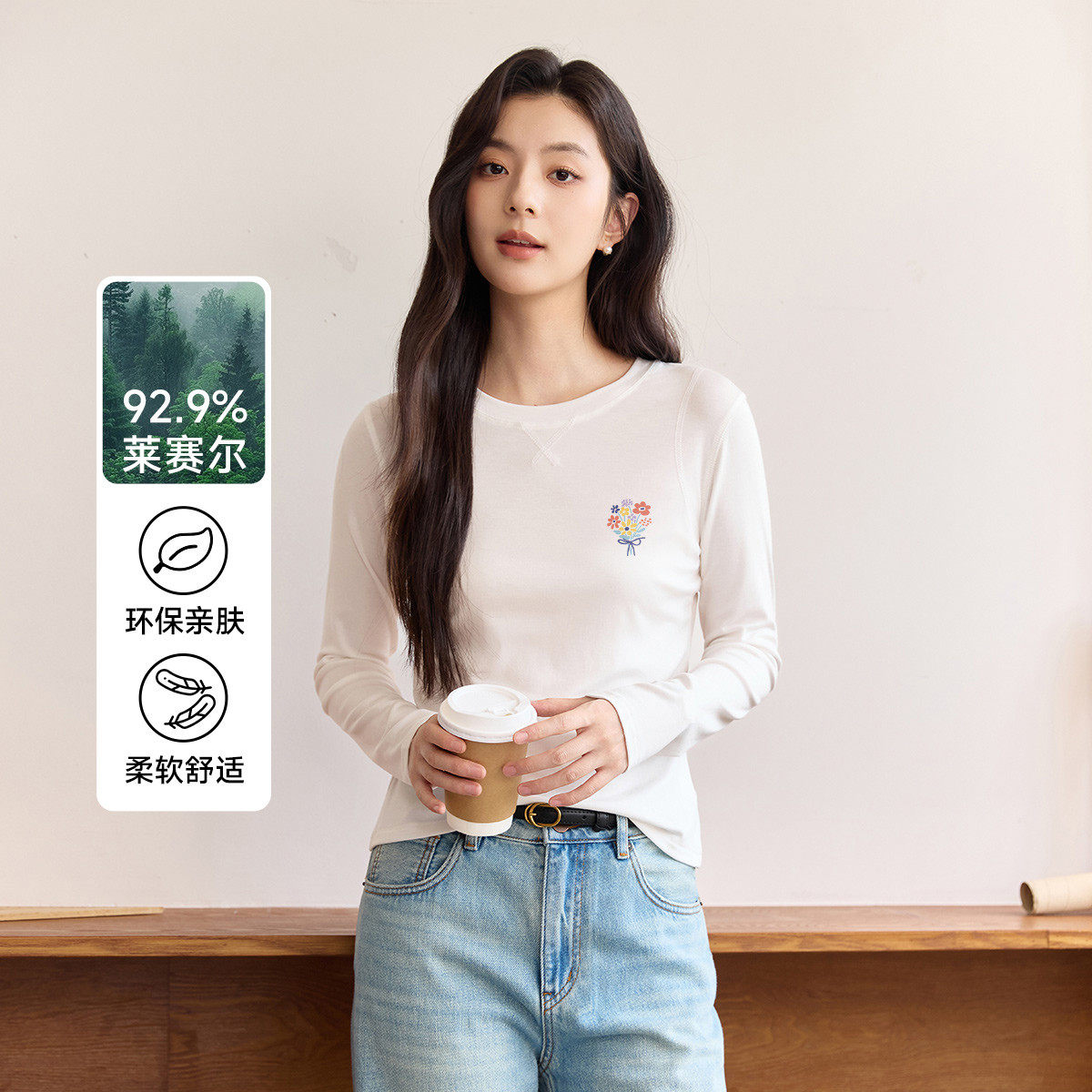 茵曼2026春季新款莱赛尔长袖t恤女正肩休闲修身显瘦上衣打底衫