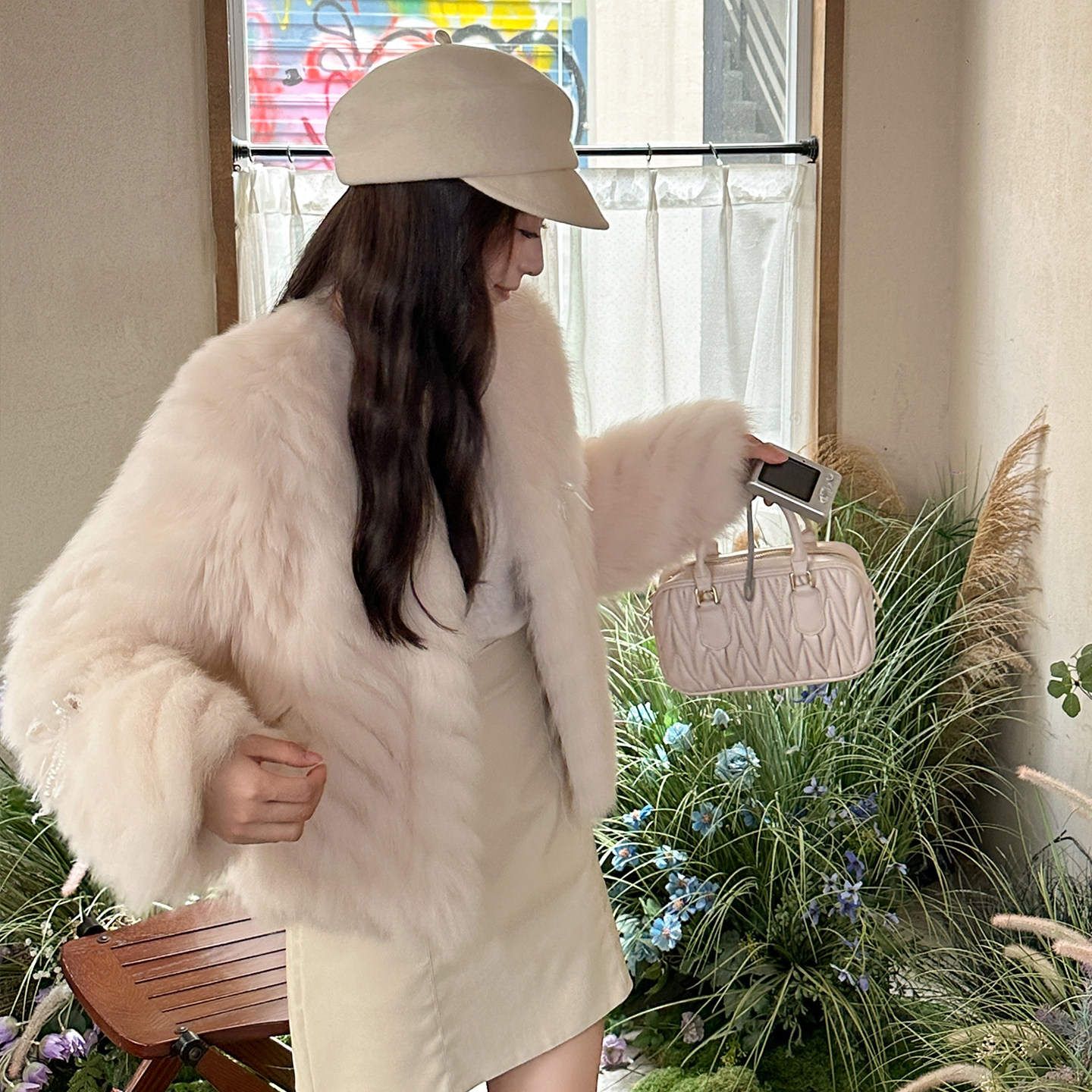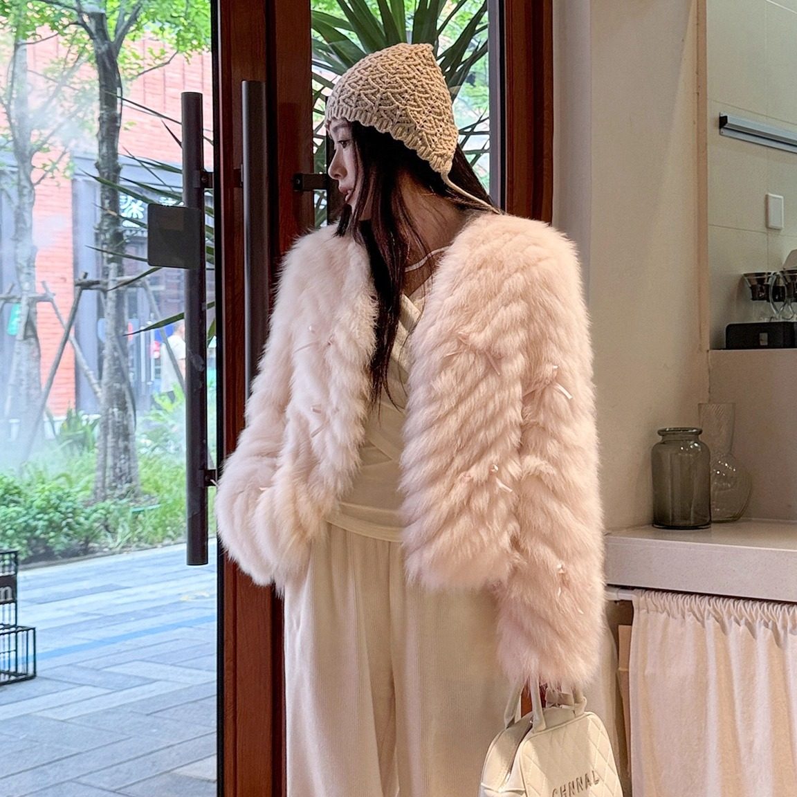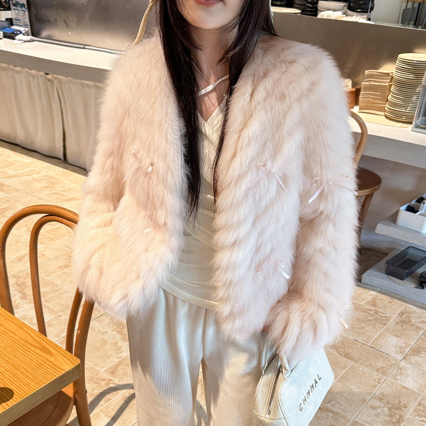 MISSZHANG蝴蝶结狐狸毛皮草外套女2025冬季年轻短款毛毛外套女