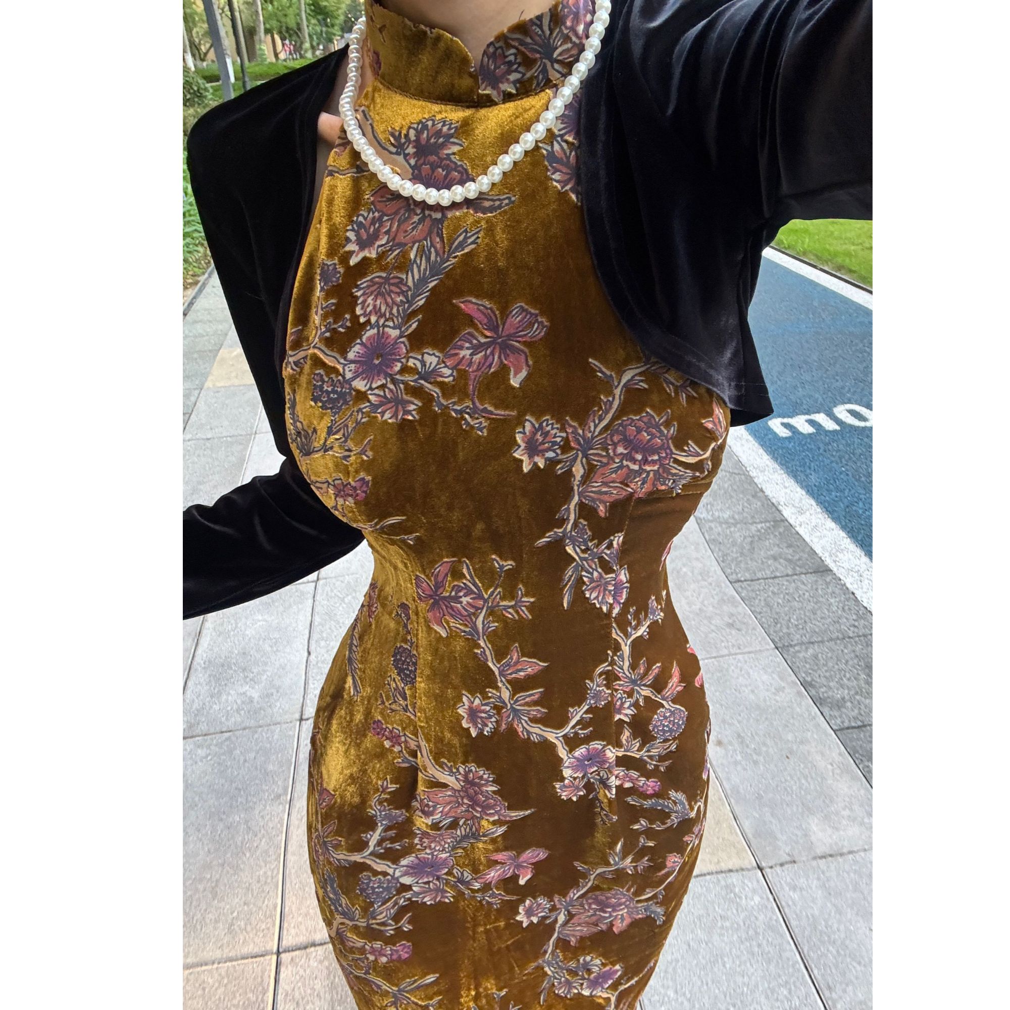 秋辞香~金枝芙蓉 金色挖肩丝绒长款重工秋冬气质中长款旗袍