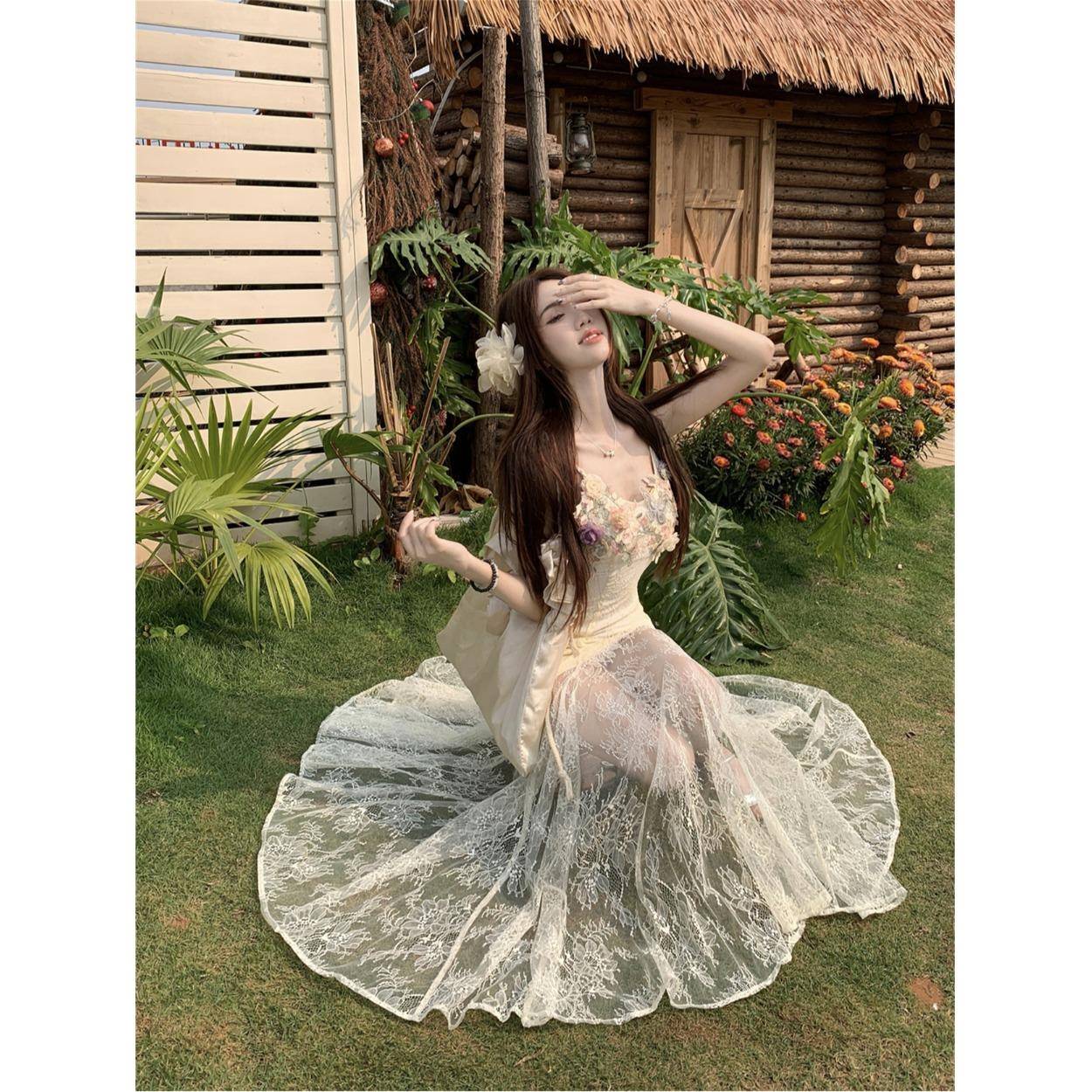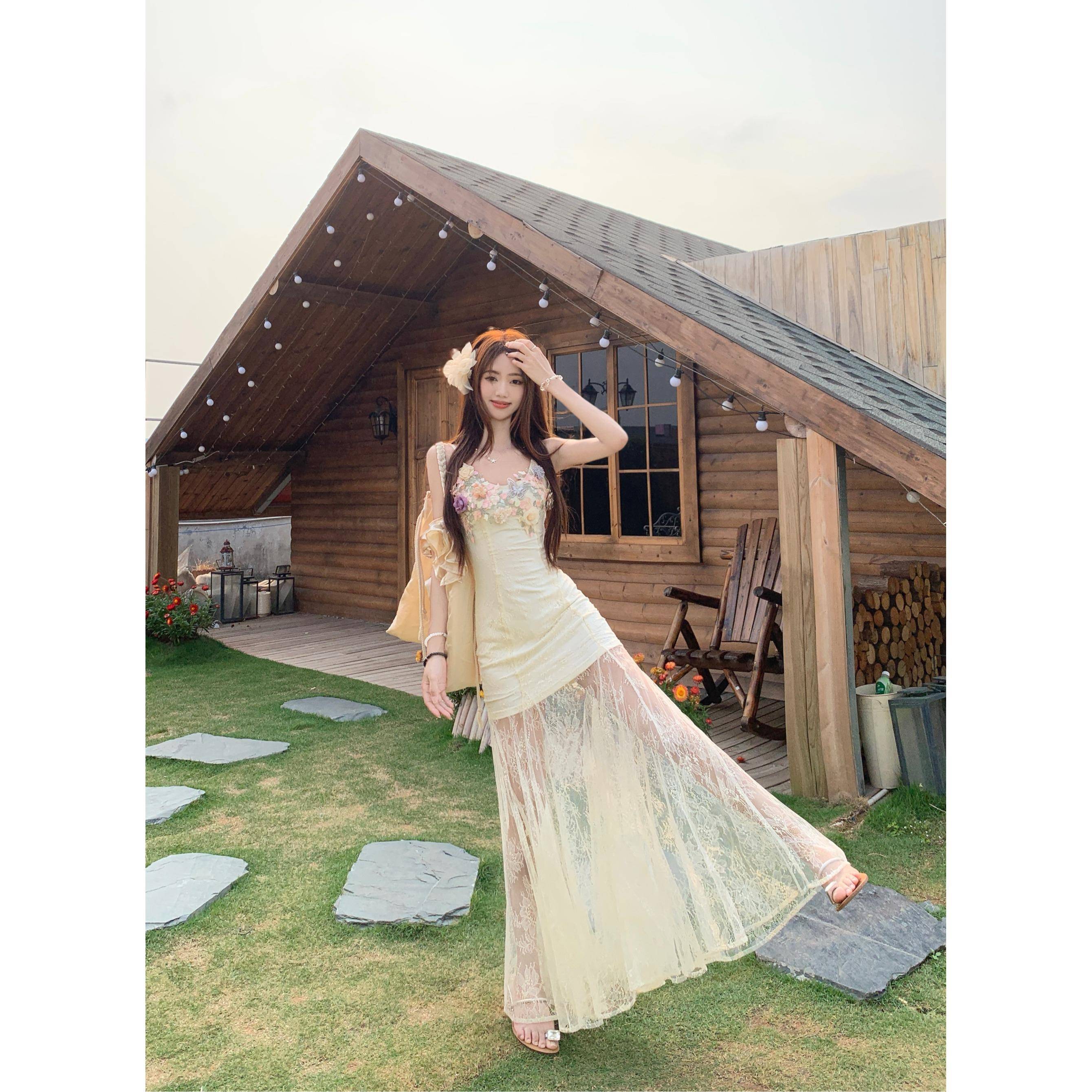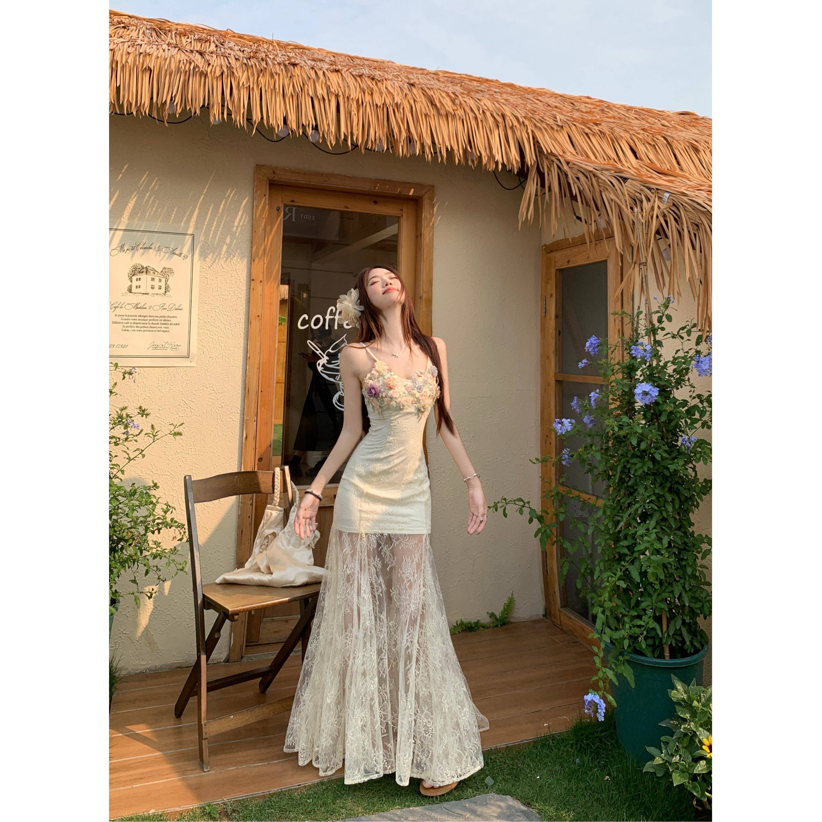 法式绝美花朵吊带连衣裙女夏季蕾丝拼接度假裙子修身收腰包臀长裙